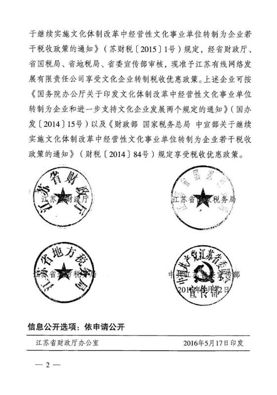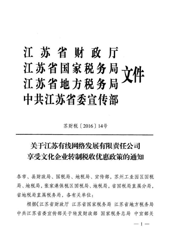 关于江苏有线网络发展有限责任公司享受文化企业转制税收优惠政策的通知