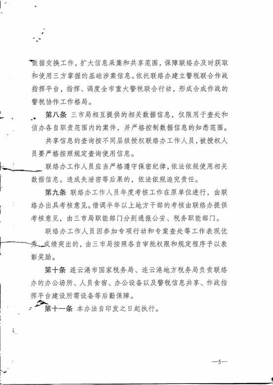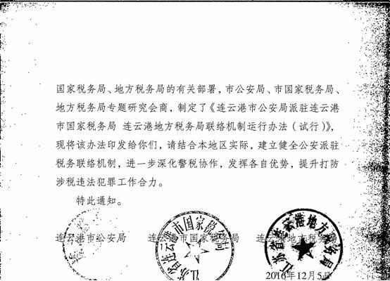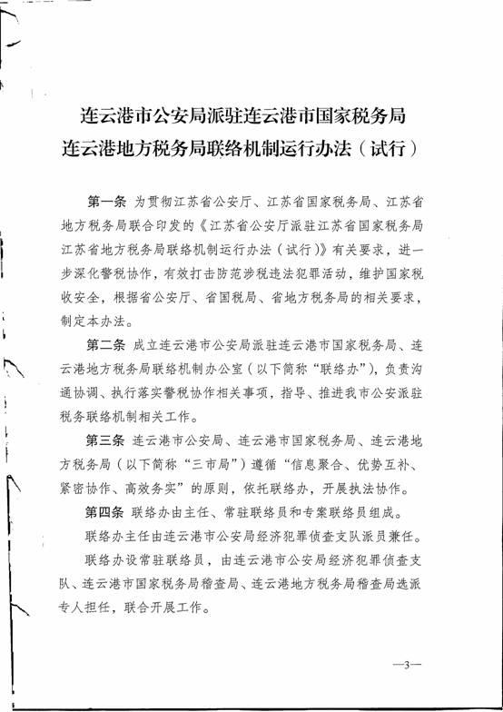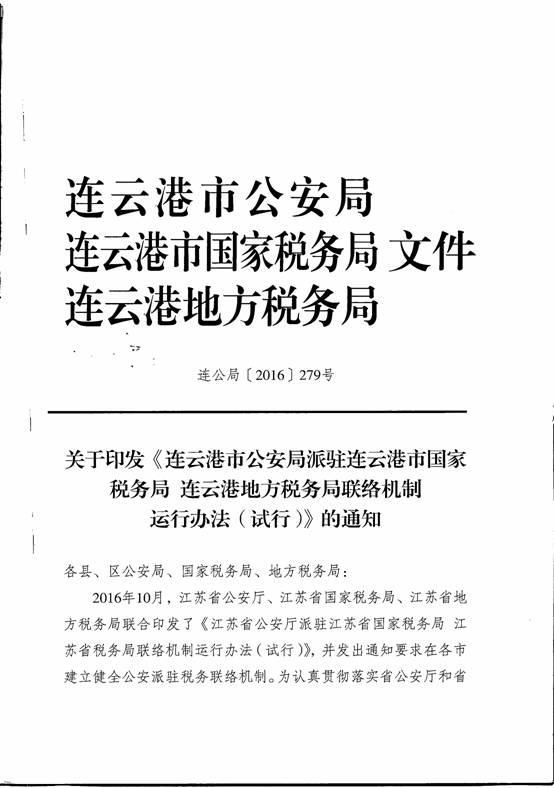 连云港市公安局派驻连云港市国家税务局 连云港地方税务局联络机制运行办法(试行)>的通知: