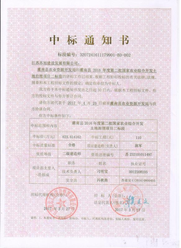 2016年度第二批国家农业综合开发土地治理项目二标段中标通知书