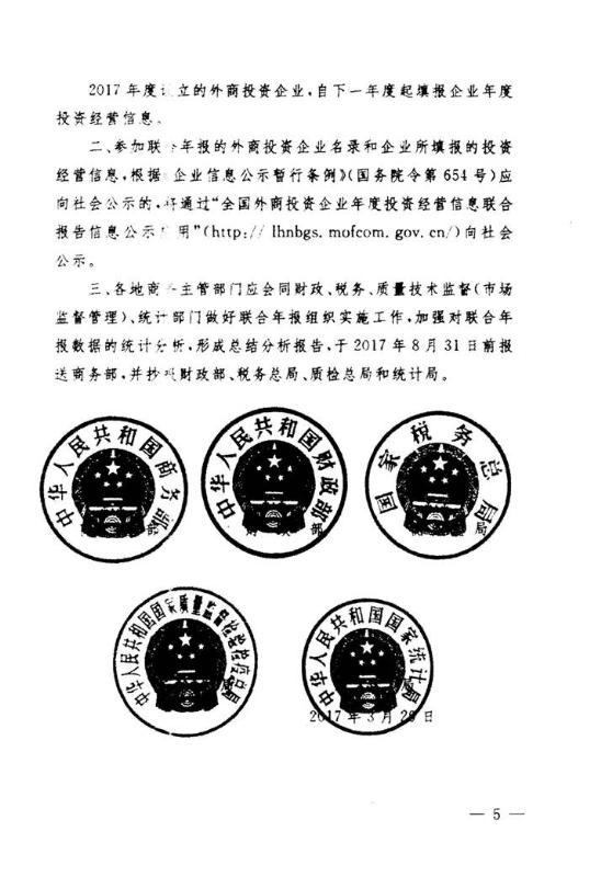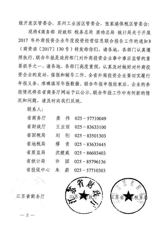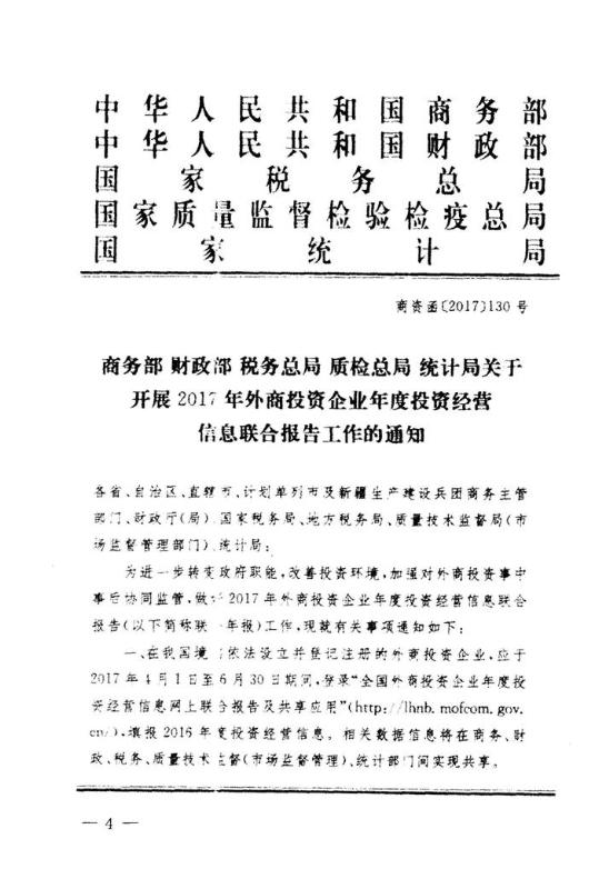 省商务厅等六部门转发商务部 财政部 税务总局质检总局 统计局关于开展2017年外商投资企业年度投资经营信息联合报告工作的通知: