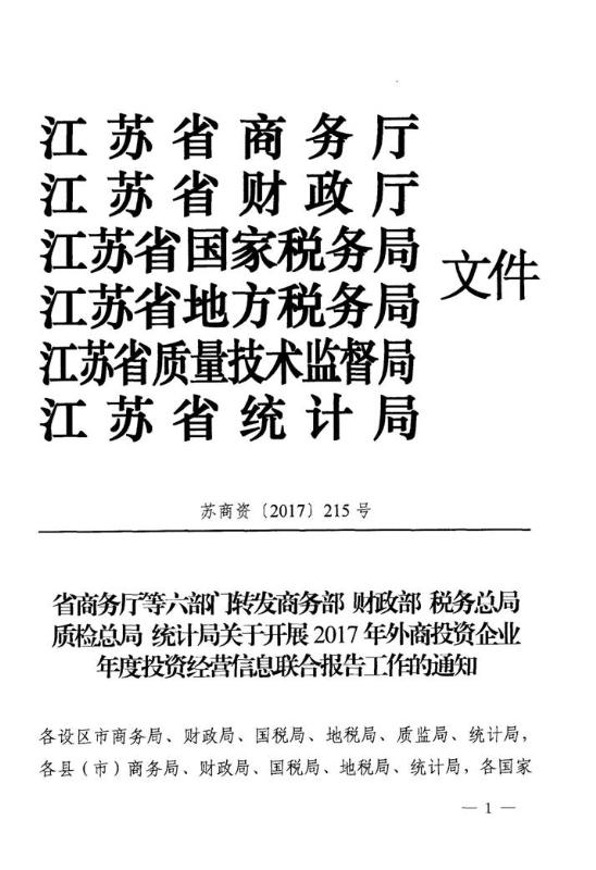 省商务厅等六部门转发商务部 财政部 税务总局质检总局 统计局关于开展2017年外商投资企业年度投资经营信息联合报告工作的通知