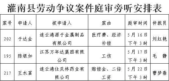 为进一步增强社会各界对劳动人事争议调解仲裁工作的了解,充分展示仲裁机构审理案件的规范化和标准化,展现仲裁员的专业性和公正性,提升调解仲裁机构的社会影响力和公信力,打造“阳光仲裁”,灌南县劳动人事争议仲裁院定于2018年5月开展“仲裁开放月”活动。现选取3起典型案件进行公开庭审,并有针对性的邀请人大代表、政协委员、工会人员、新闻记者、用人单位及劳动者代表参加旁听并听取意见和建议。
