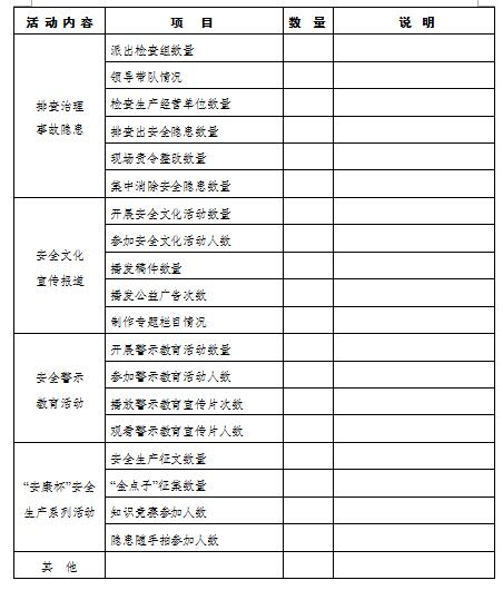 (三)加强信息报送。各单位要及时跟踪掌握“安全生产月”部署开展情况,做好活动信息的整理、收集、报送。“安全生产月”期间,请于每周三上午10时前报送本单位活动开展情况统计表(见附件1),报送情况将纳入年度交通运输安全工作考核;请各单位于5月30日和6月30日前,分别报送2018年“安全生产月”活动方案和总结。