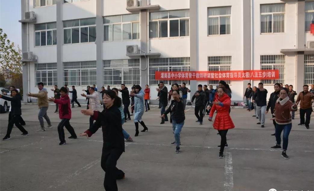 为贯彻落实中华传统武术文化进校园,进一步丰富我县中小学生“阳光体育活动”,提高社会体育指导员的业务素养,11月23日,由县教育局、县教师发展中心、县文广体局联合举办的“灌南县中小学体育骨干教师研训暨社会体育指导员太极(八法五步)培训”在灌南县初级中学举办。本次活动培训由中国武术6段、江苏省社会体育一级指导员张源老师担任教练。全县120余名体育教师参加了本次培训。
