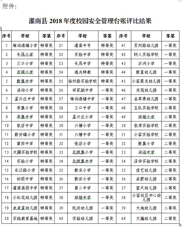 为进一步强化学校安全管理责任、细化安全管理环节,落实校园安全管理“一日流程”,规范安全管理台账记录,提升校园安全管理质量,县教育局开展了全县中小学(幼儿园)2018年度校园安全管理台账评比活动。经评比,堆沟港镇小学等25所学校获特等奖,田家炳中学等22所学校获一等奖,五队实验学校等13所学校获二等奖。现将具体评比结果公布如下(见附件)。