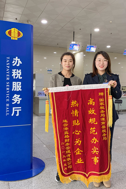 近日,一面印有“高效规范办实事,热情贴心为企业”的锦旗送到了我局办税服务厅。来自连云港真格财务管理有限公司的施女士,致敬办税服务厅全体税务人员,感谢他们以纳税人需求为导向,切实为纳税人办好事,办实事。“办税人员主动推迟下班时间,让我们少跑路,尽享减税降费红利!”碎金般的阳光将朱红色的锦旗映照得格外引人注目,体现税务干部便民办税的暖心,彰显税企鱼水之情。