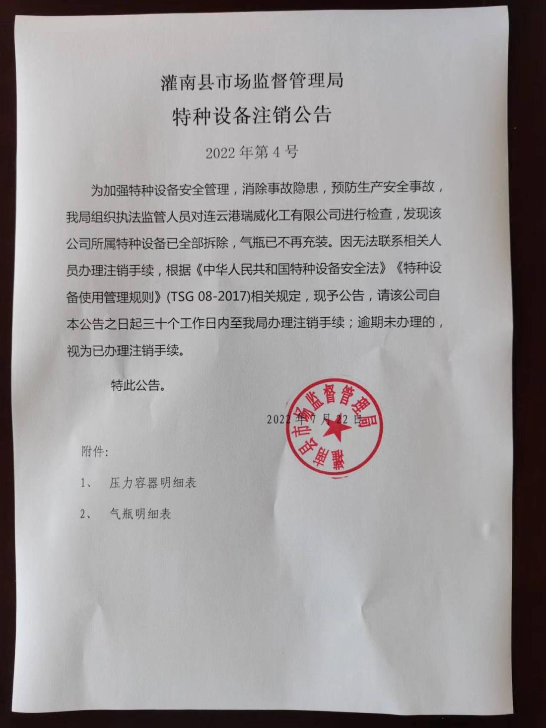 灌南县市场监督管理局特种设备注销公告2022年第4号为加强特种设备安全管理,消除事故隐患,预防生产安全事故,我局组织执法监管人员对连云港瑞威化工有限公司进行检查,发现该公司所属特种设备已全部拆除,气瓶已不再充装。因无法联系相关人员办理注销手续,根据《中华人…