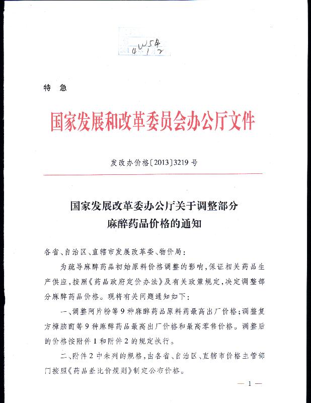 现将《国家发展改革委办公厅关于调整部分麻醉药品价格的通知》(发改办价格[2013]3219号)文件转发给你们,请遵照执行。附件麻醉药品中未列规格,请生产企业向省物价局申报,我局将制定公布相关药品最高零售价格。