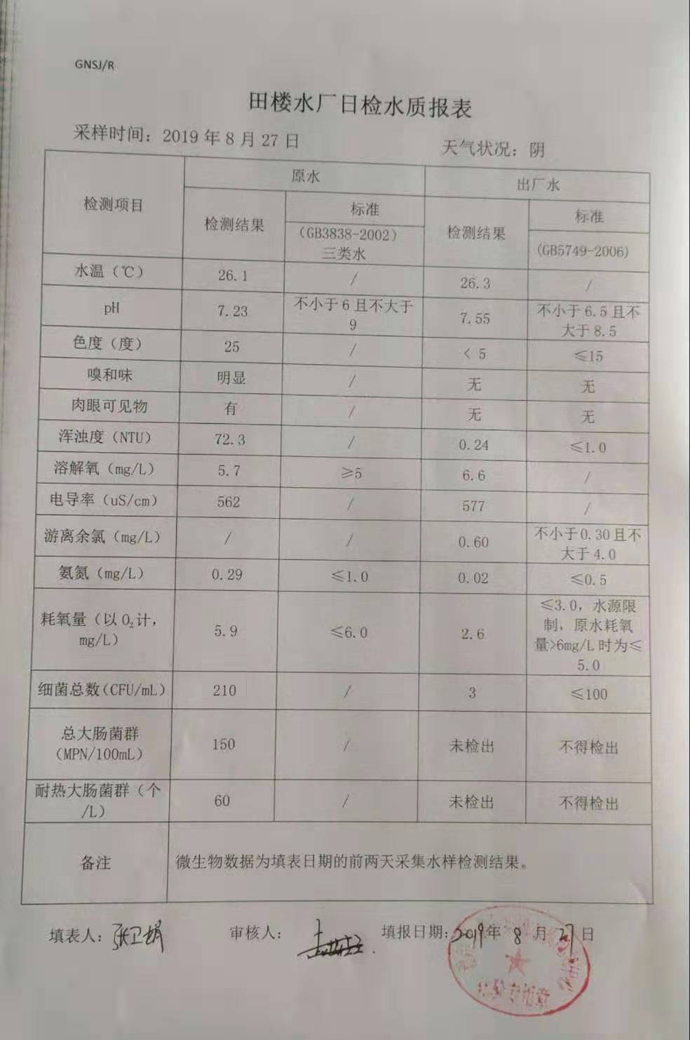 2019年8月27日田楼水厂水质报表