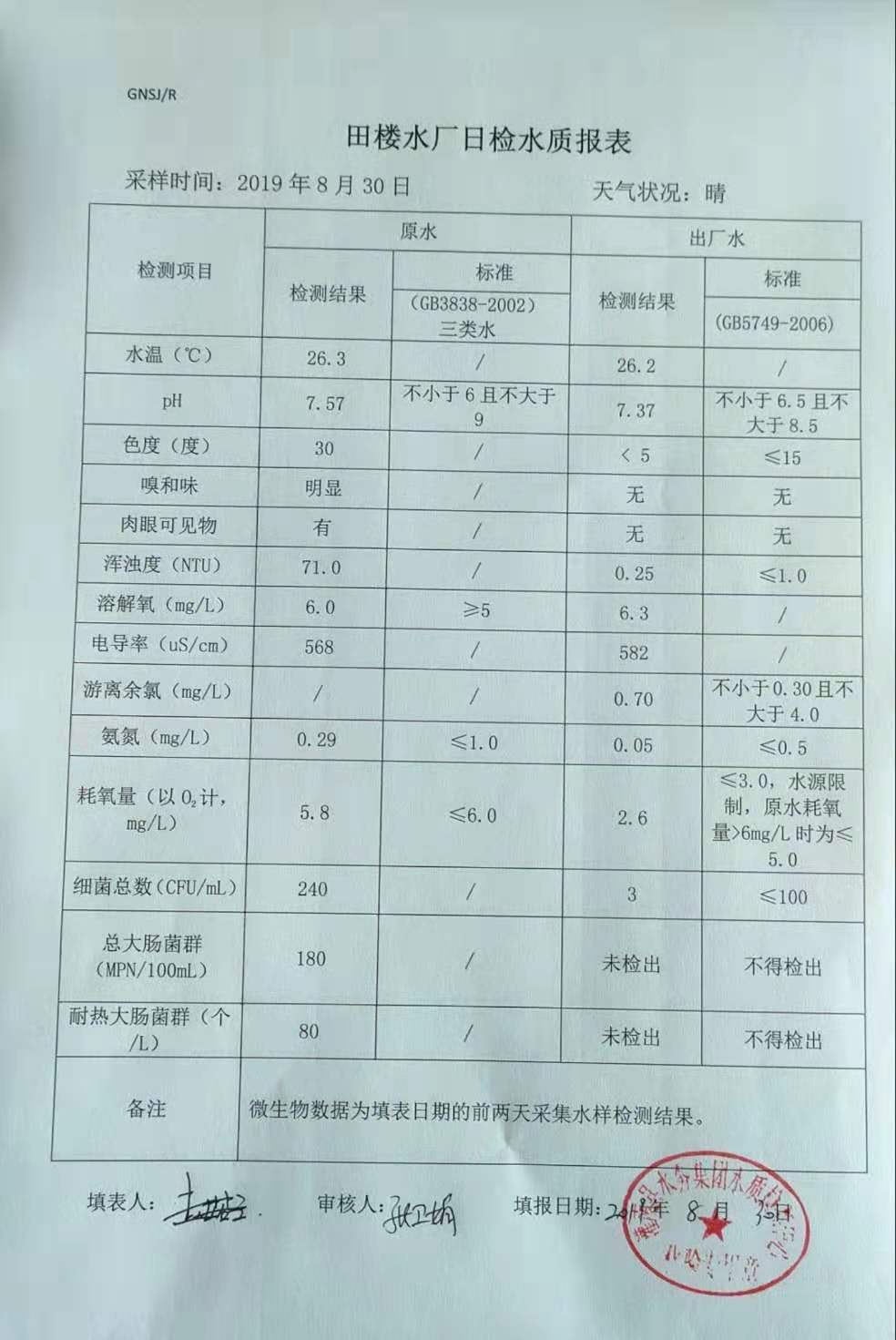 2019年8月30日田楼水厂水质报表
