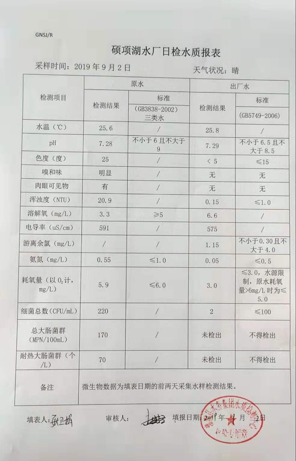 2019年9月2日硕项湖水厂水质报表