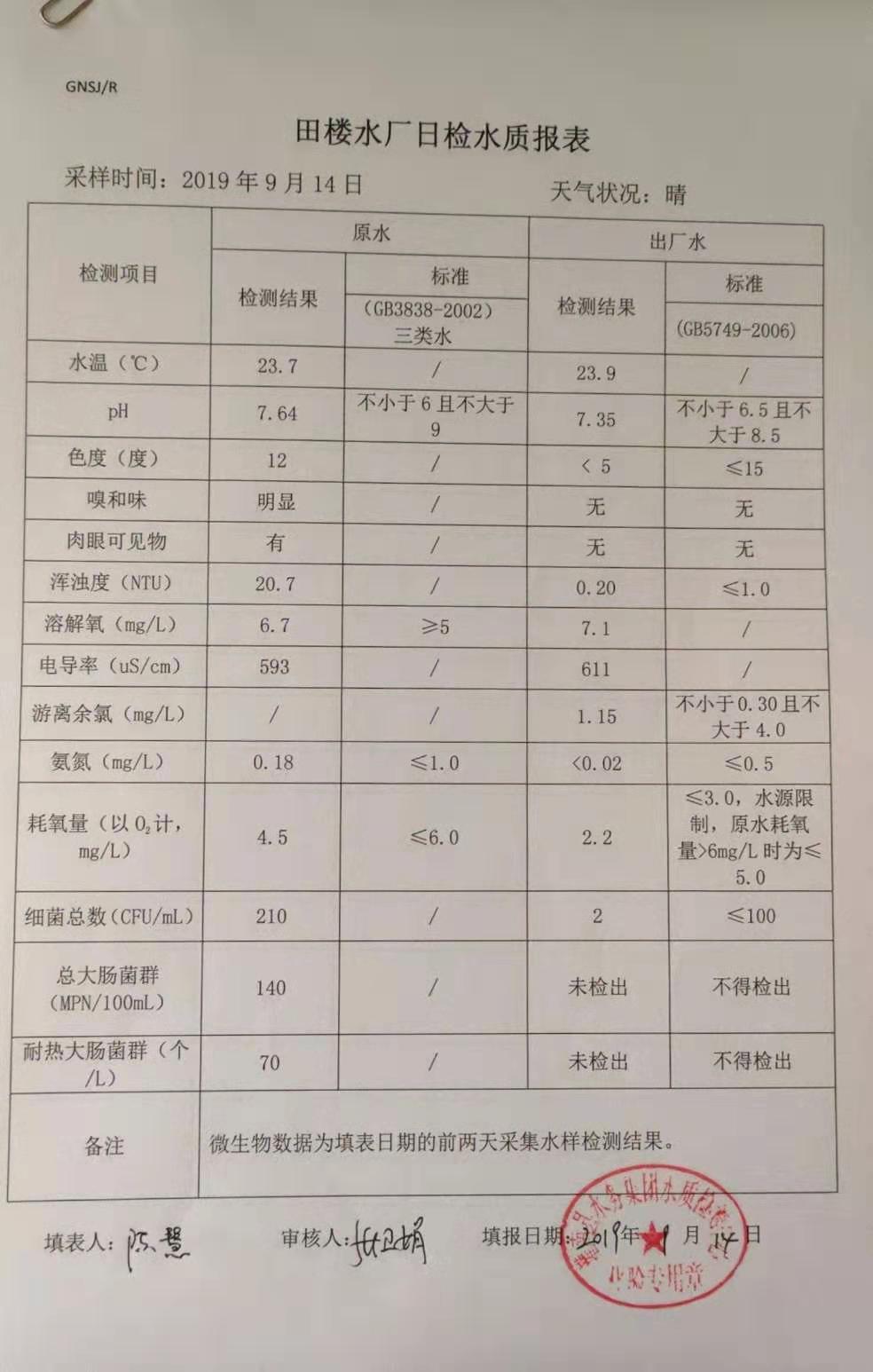 2019年9月14日田楼水厂水质报表