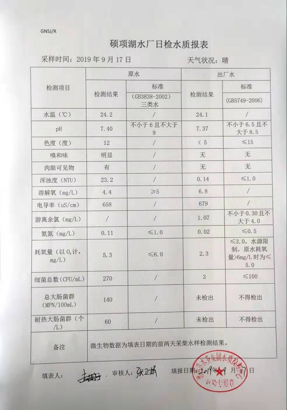 2019年9月17日硕项湖水厂水质报表