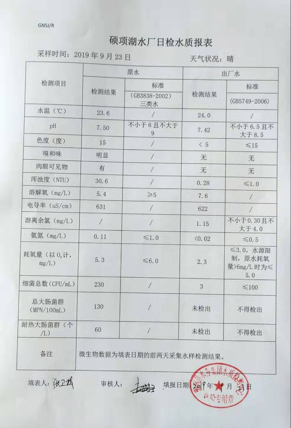 2019年9月23日硕项湖水厂水质报表