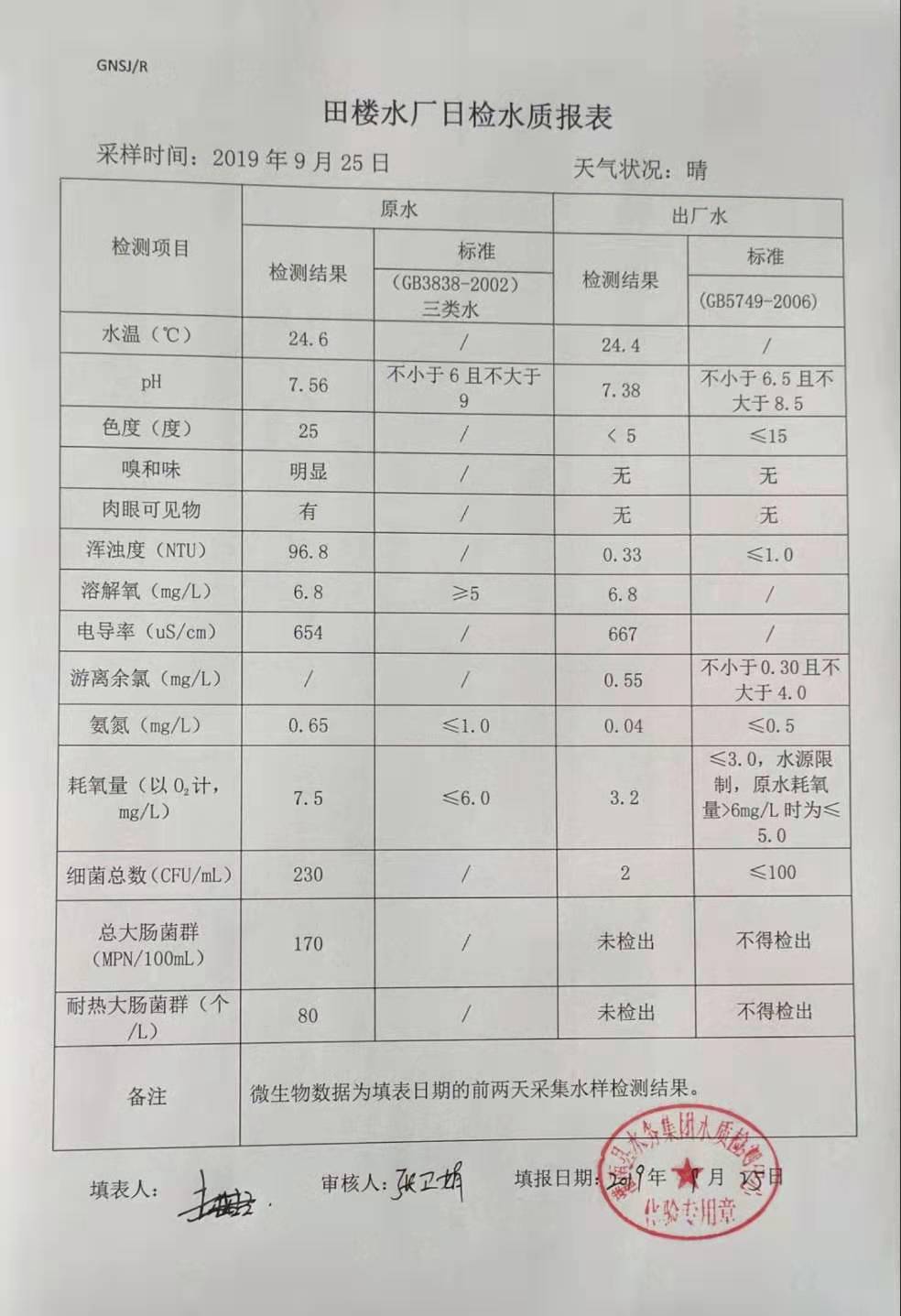 2019年9月25日田楼水厂水质报表