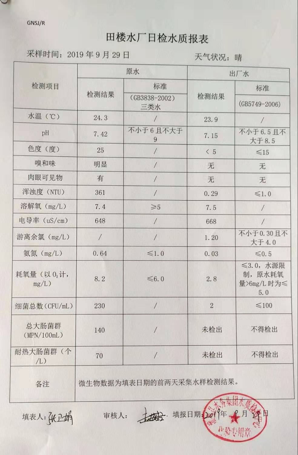 2019年9月29日田楼水厂水质报表