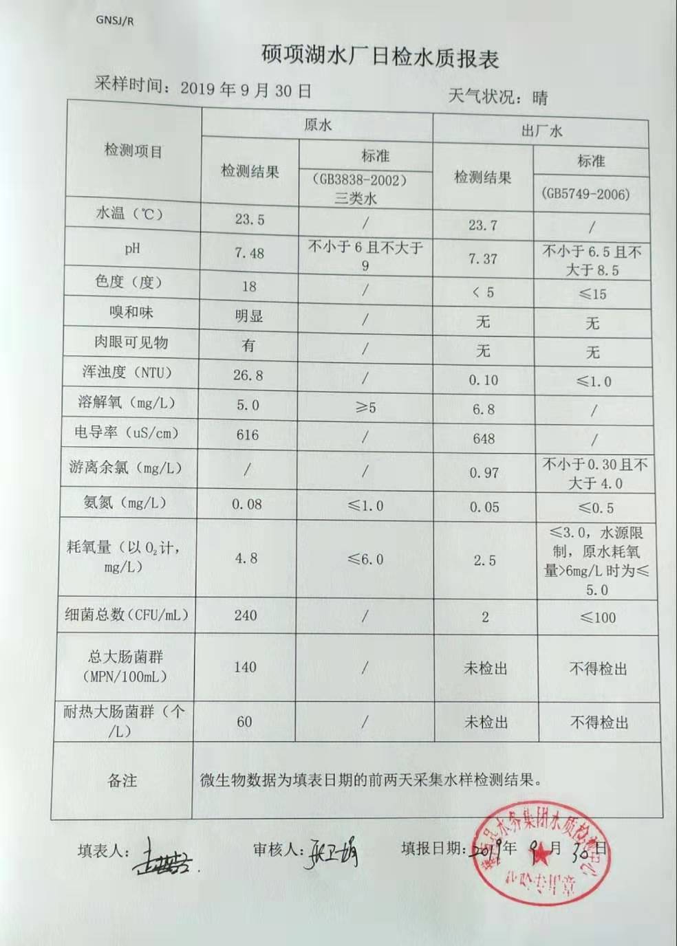 2019年9月30日硕项湖水厂水质报表
