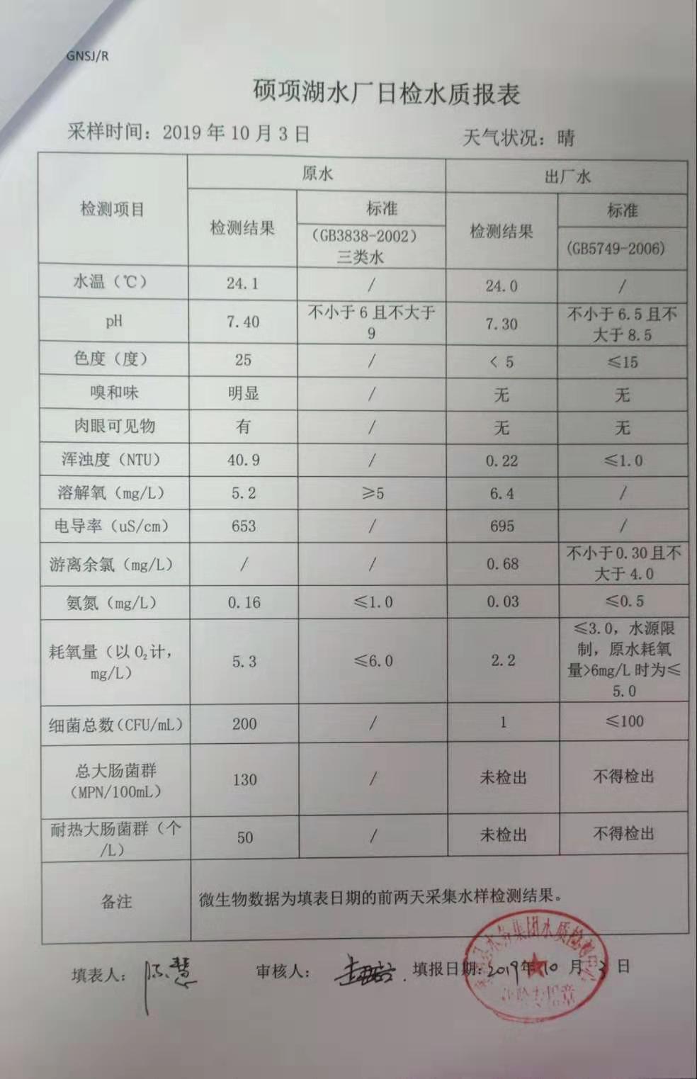 2019年10月3日硕项湖水厂水质报表