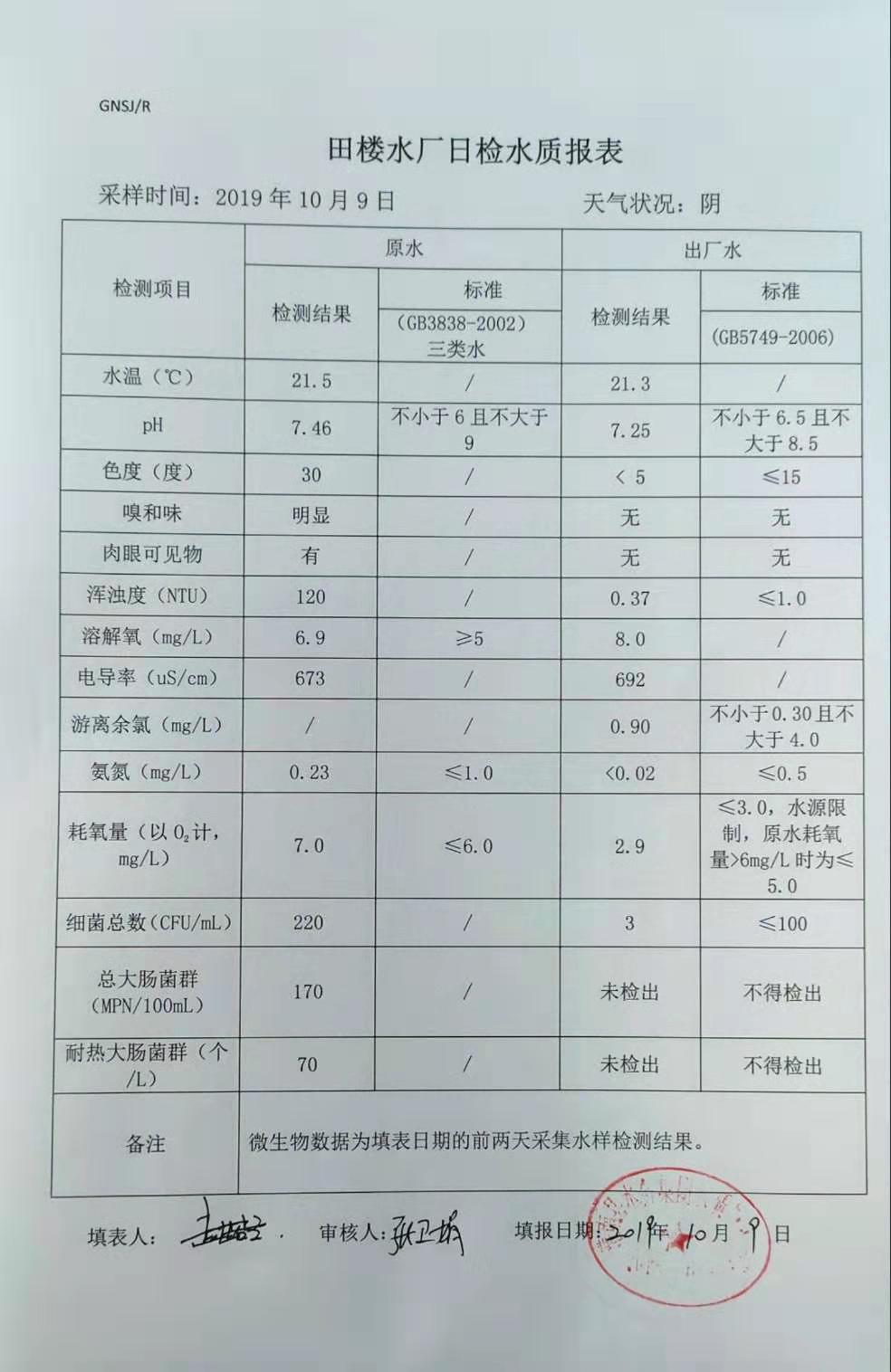 2019年10月9日田楼水厂水质报表