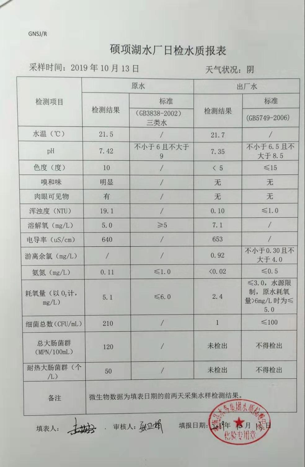 2019年10月13日硕项湖水厂水质报表