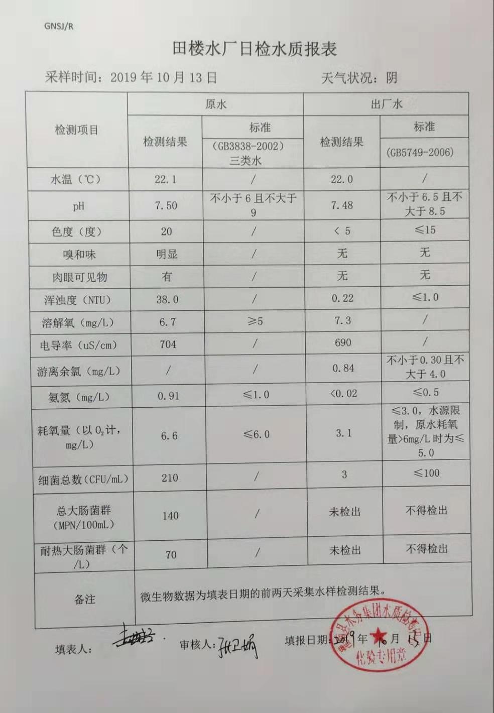 2019年10月13日田楼水厂水质报表
