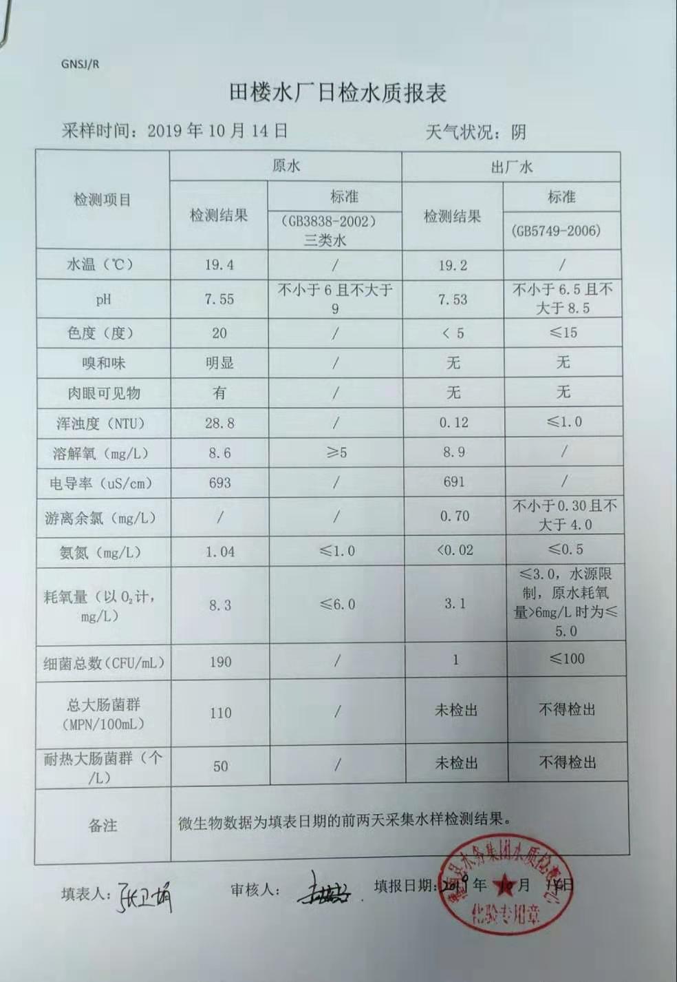 2019年10月14日田楼水厂水质报表