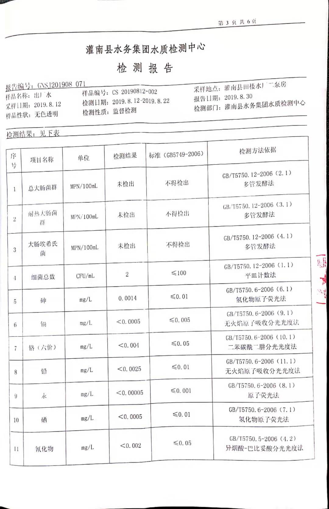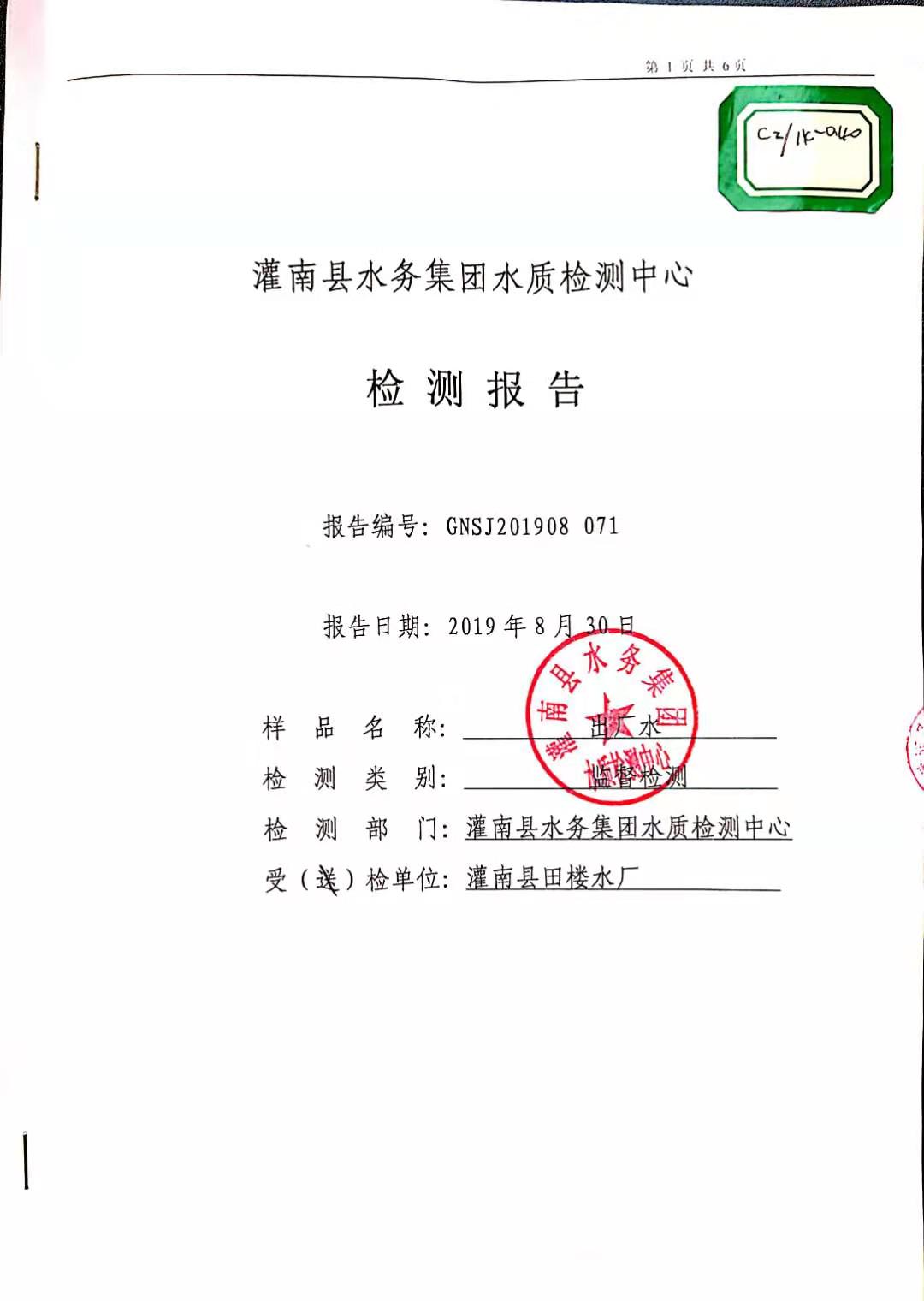 2019年8月田楼水厂水质监督检测报告