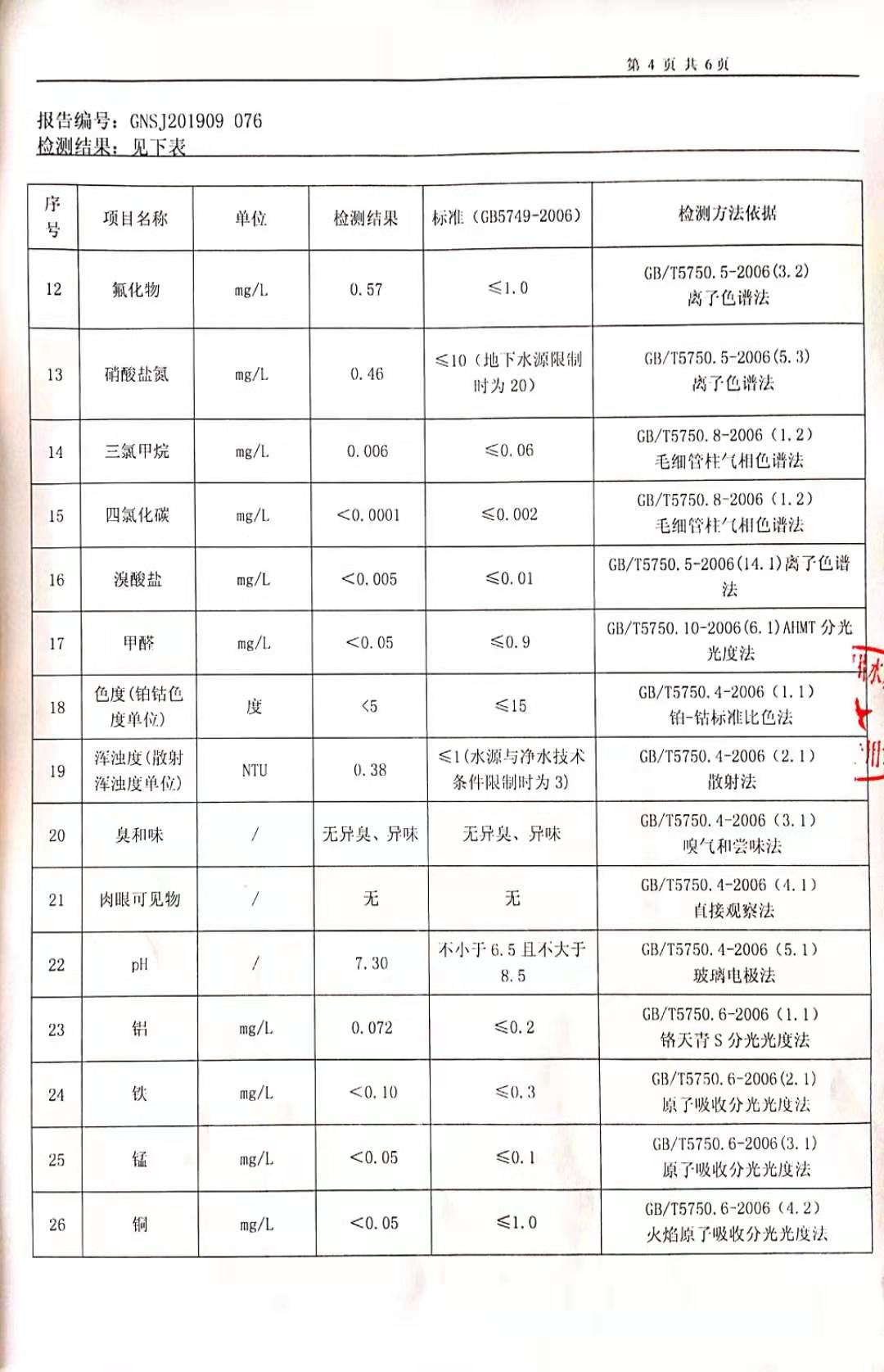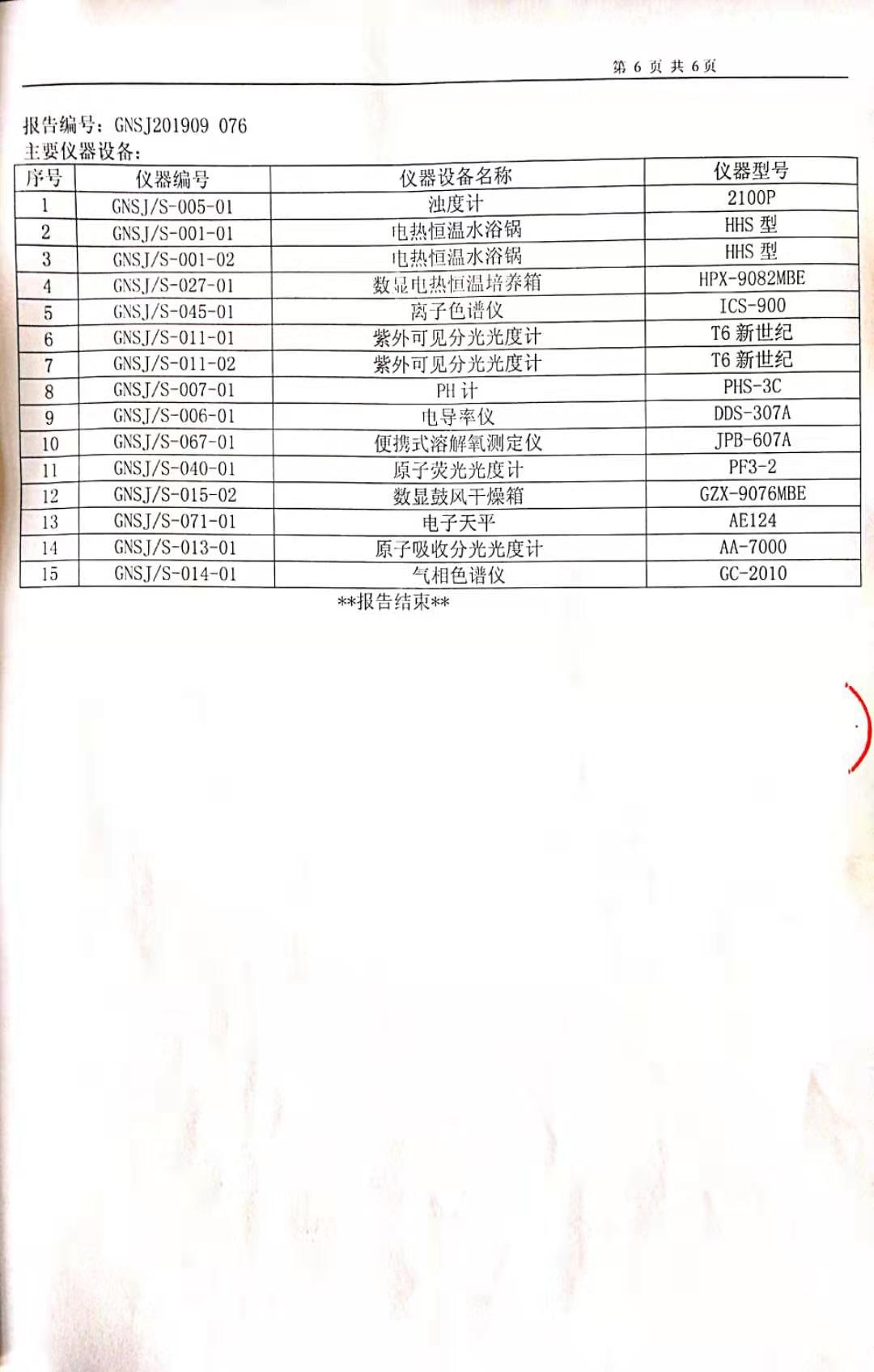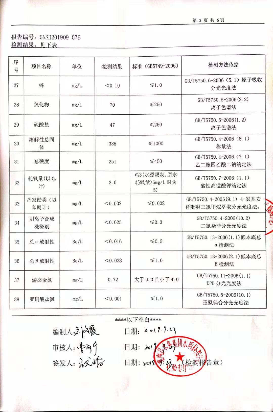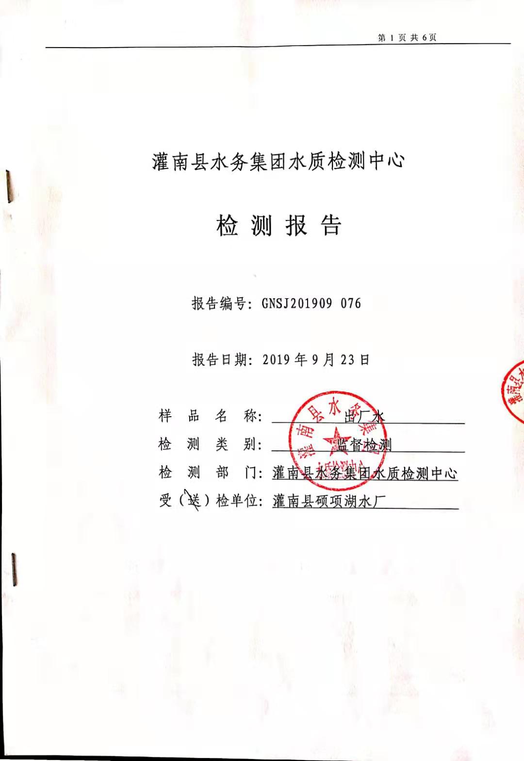 2019年9月硕项湖水厂水质监督检测报告