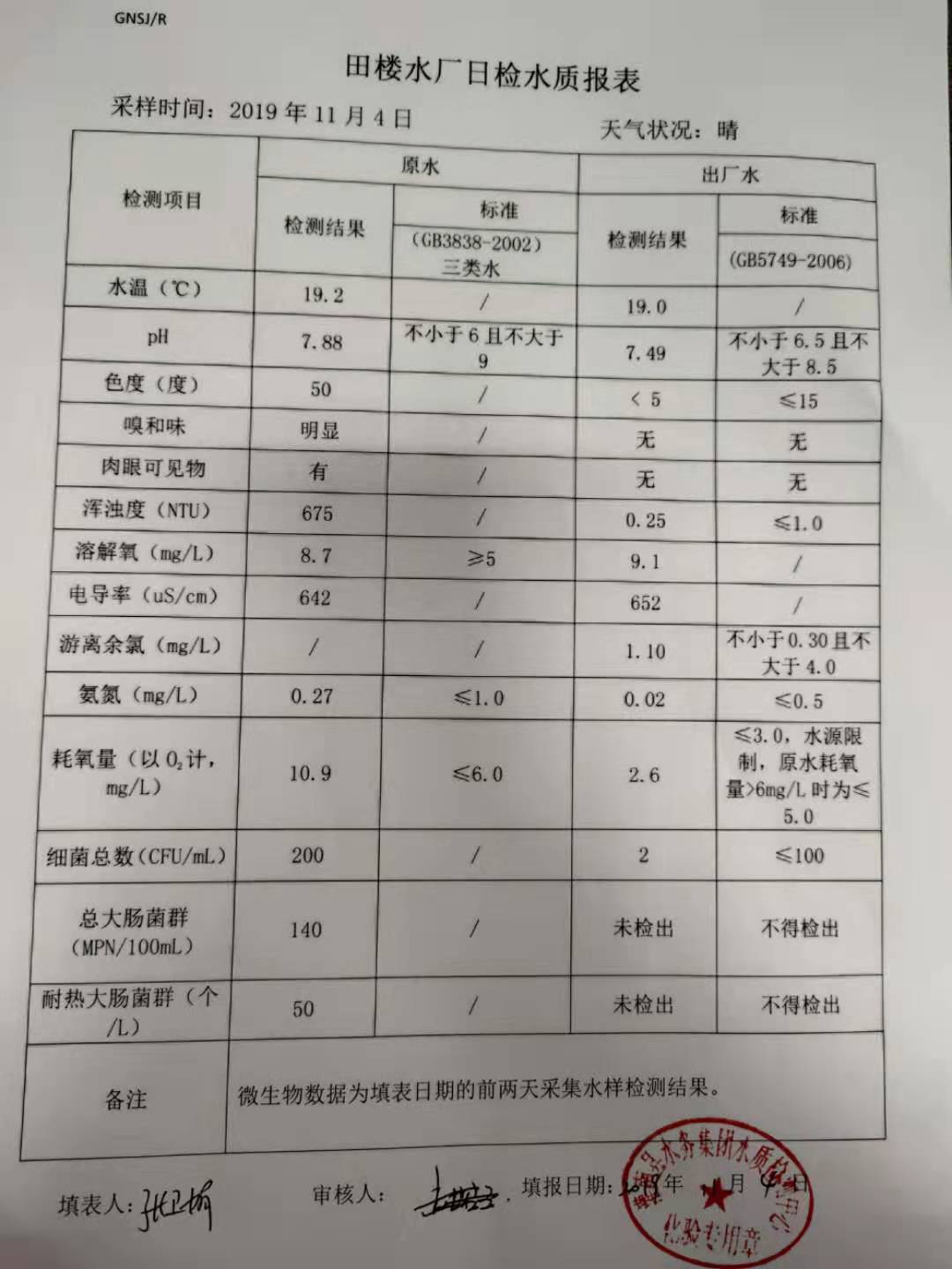 2019年11月4日田楼水厂水质报表