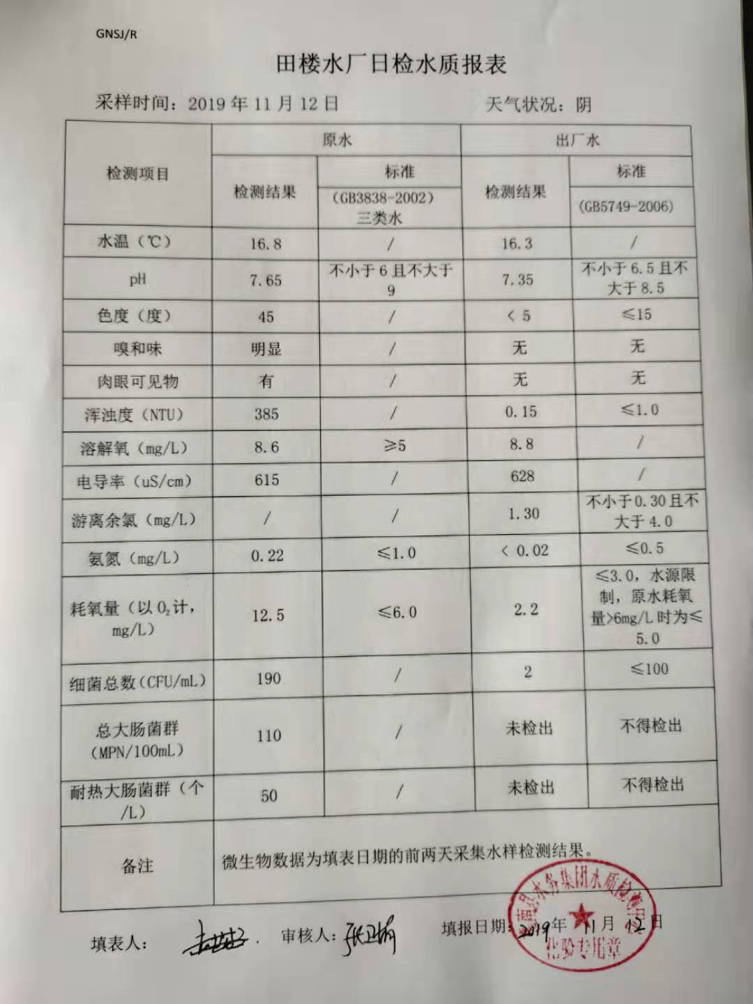 2019年11月12日田楼水厂水质报表
