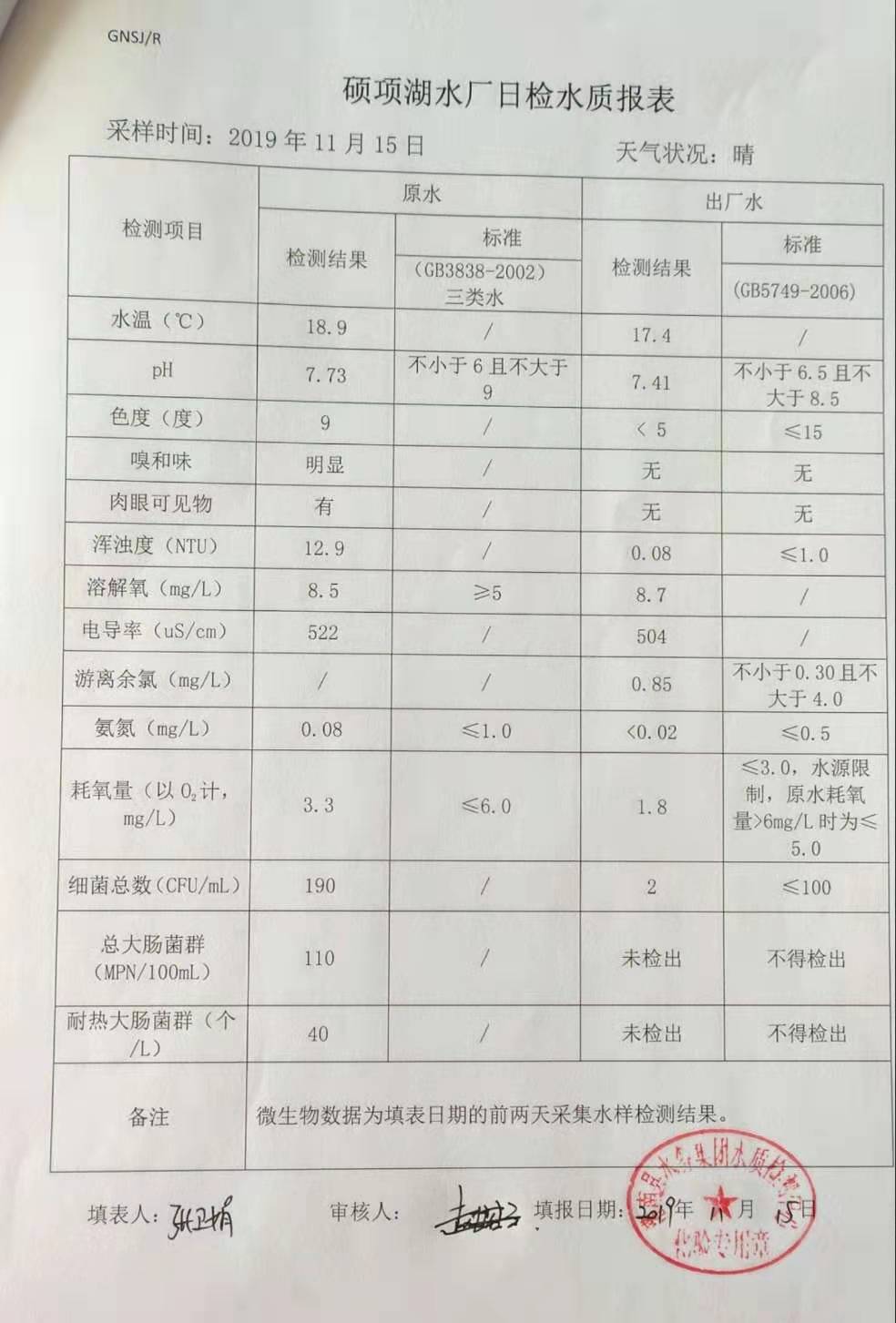 2019年11月15日硕项湖水厂水质报表