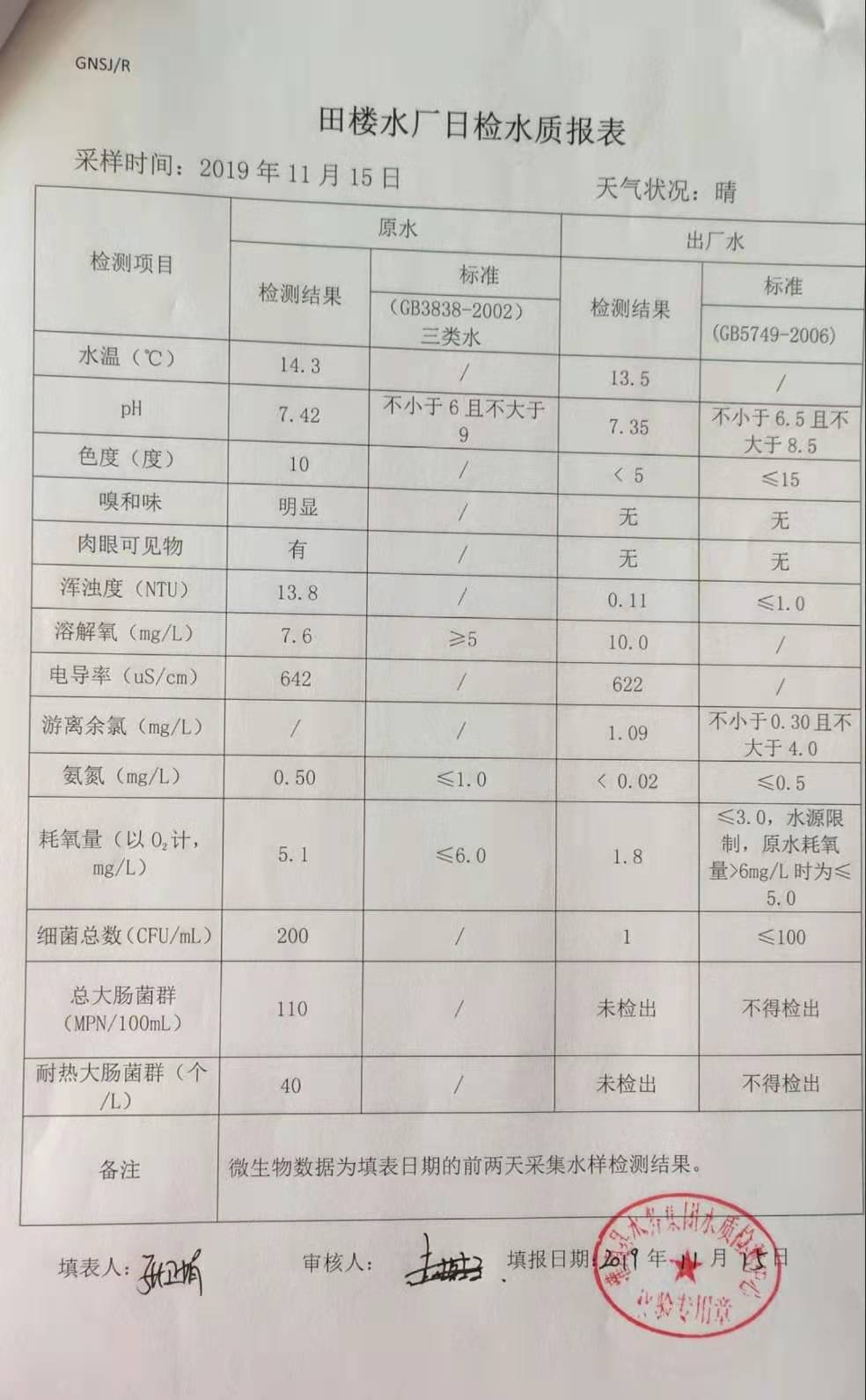 2019年11月15日田楼水厂水质报表