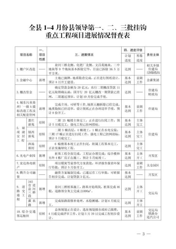 附件:全县1-4月份县领导第一、二、三批挂钩重点工程项目进展情况督查表