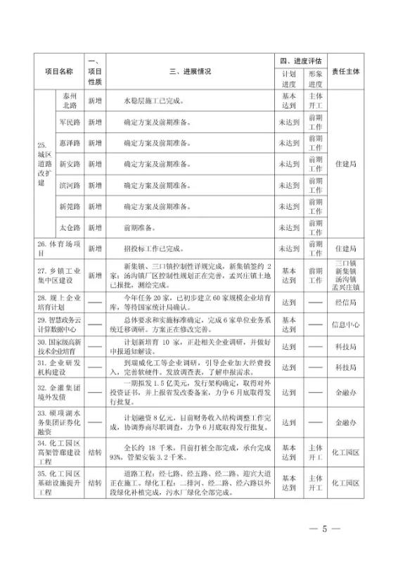 截至4月底,各项重点工作已经全面启动,当年累计投资17.3亿元,占年度计划投资20.2%。从计划进度看。建设工程23个,达到和基本达到18个、占比78.3%;产业项目14个,达到和基本达到13个、占比92.9%;工作事项9个,达到和基本达到9个、占比100%;双城同创项目16个,完成和达到16个、占比100%。从形象进度看。建设工程和产业项目主体完工2个、占比5.4%,基本过半2个、占比5.4%,主体开工13个、占比35.1%。