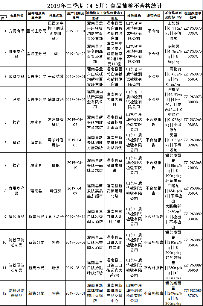 灌南县市场监督管理局食品安全抽检2019年二季度不合格名单公示