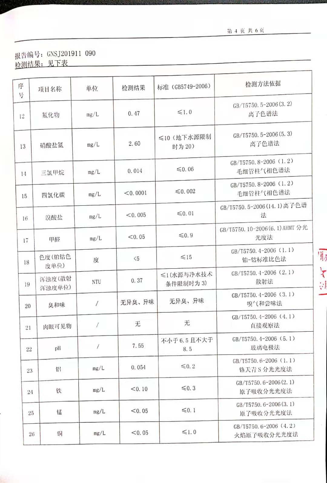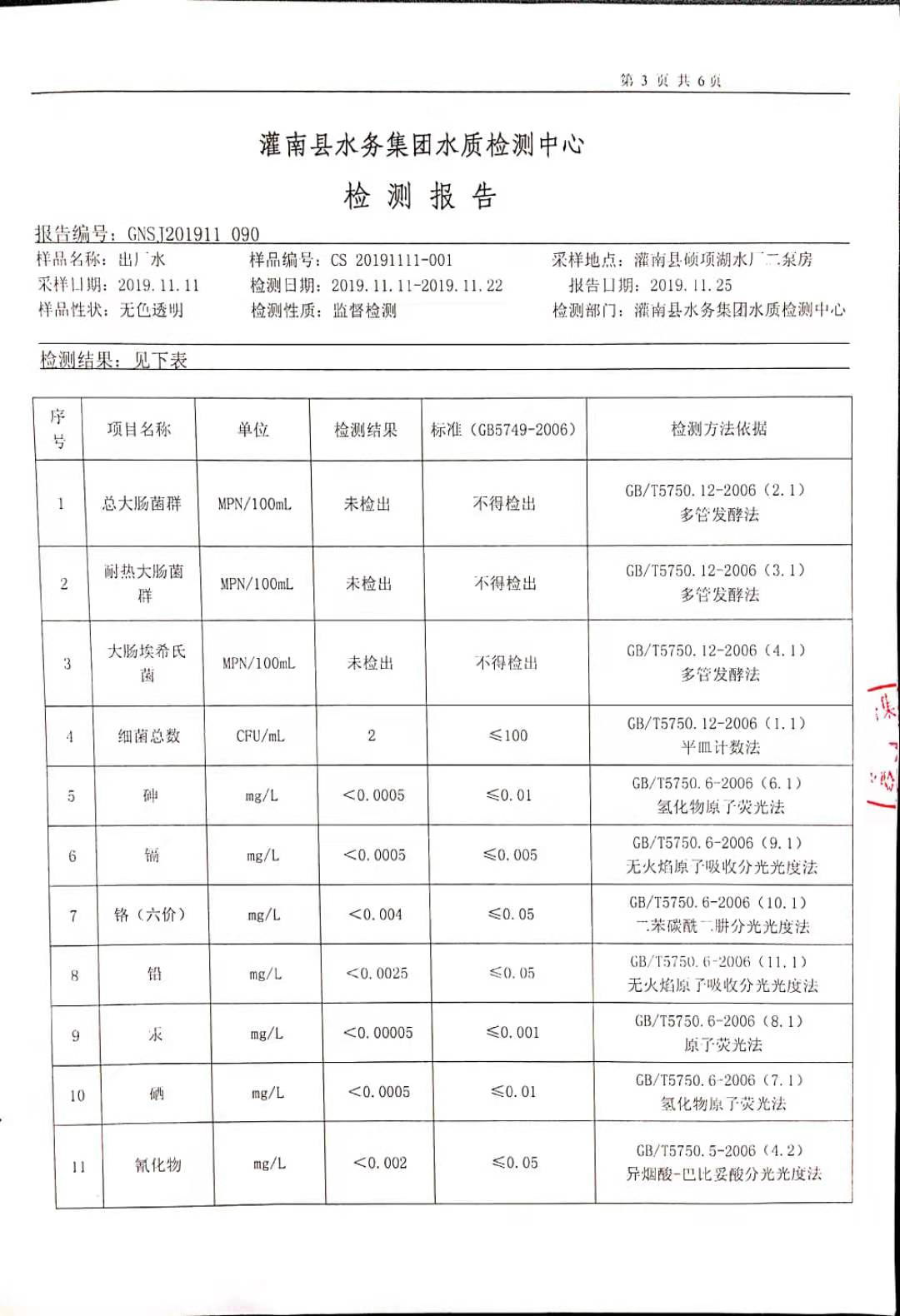 2019年11月硕项湖水厂水质监督检测报告
