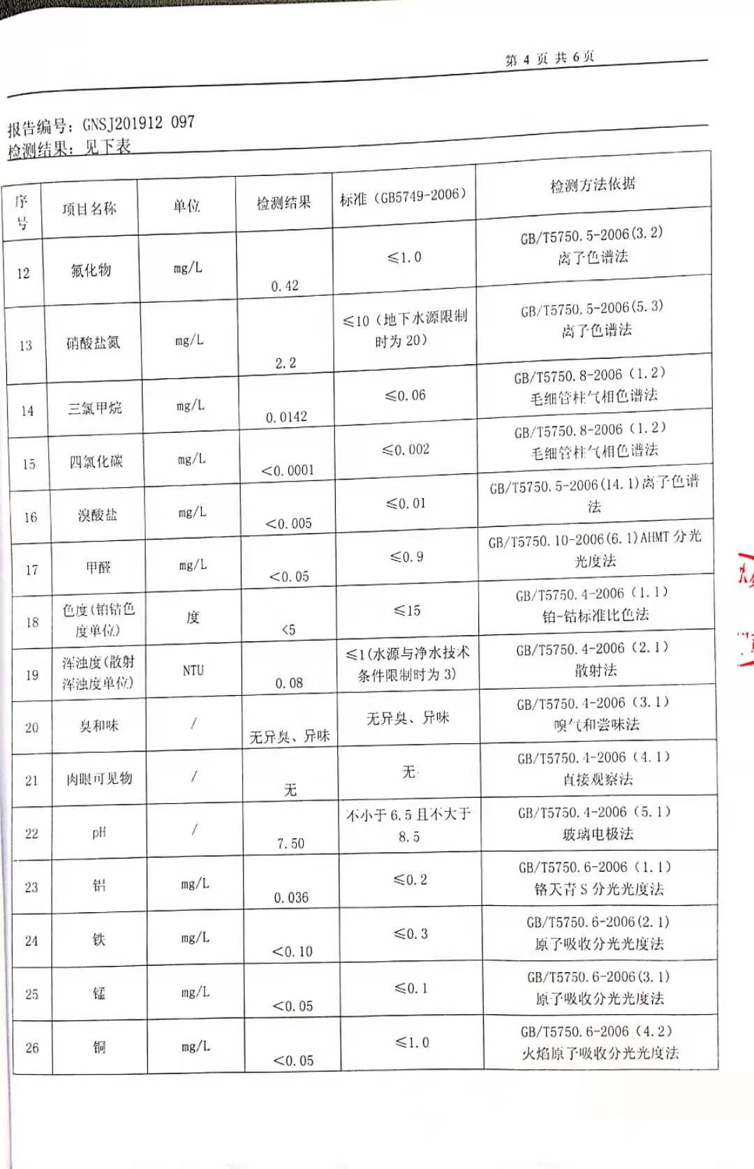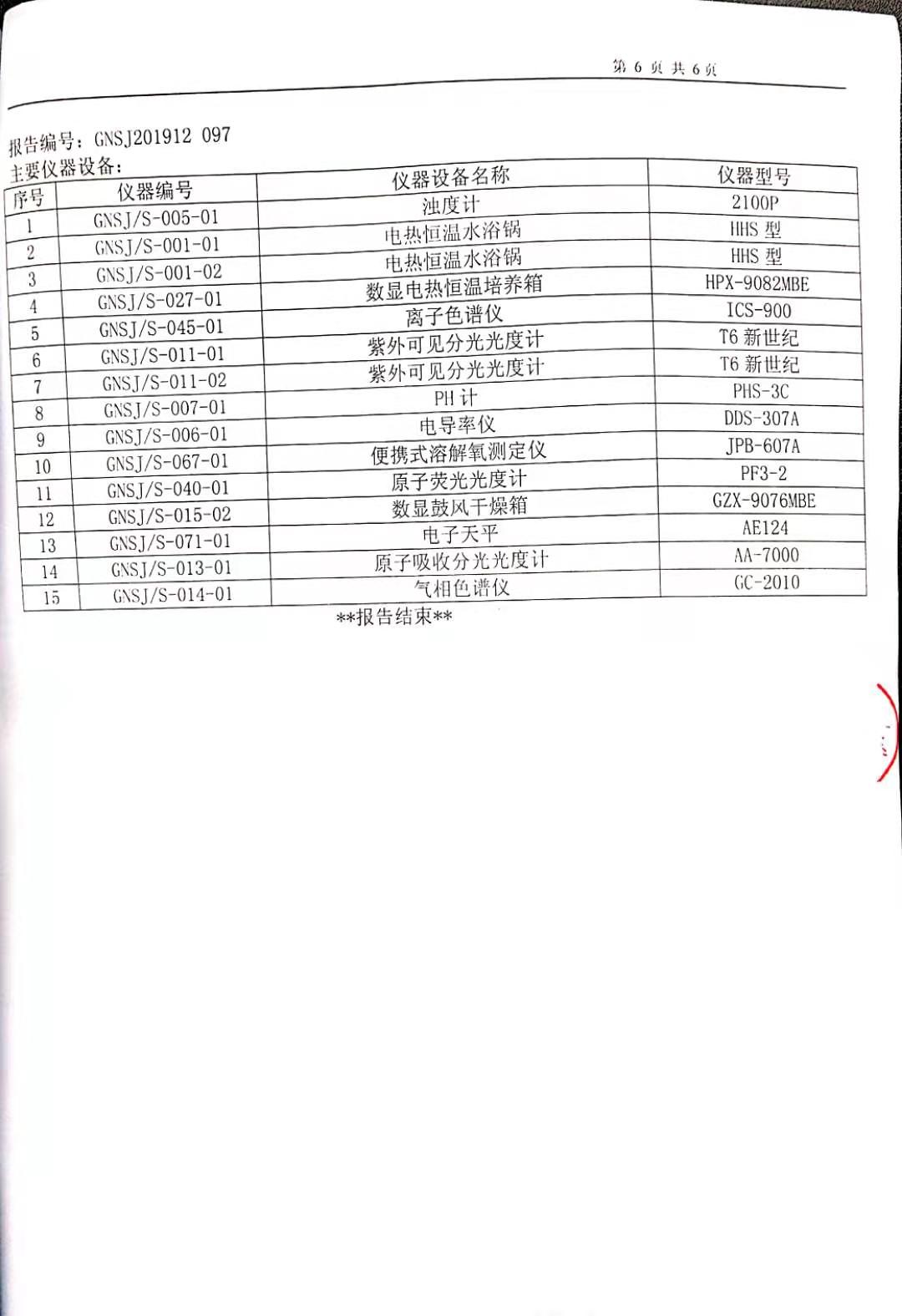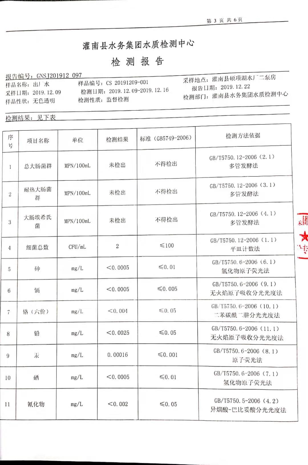 2019年12月硕项湖水厂水质监督检测报告
