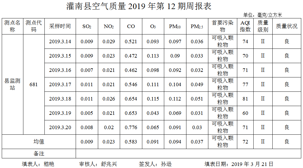 灌南县空气质量2019年第12期周报表