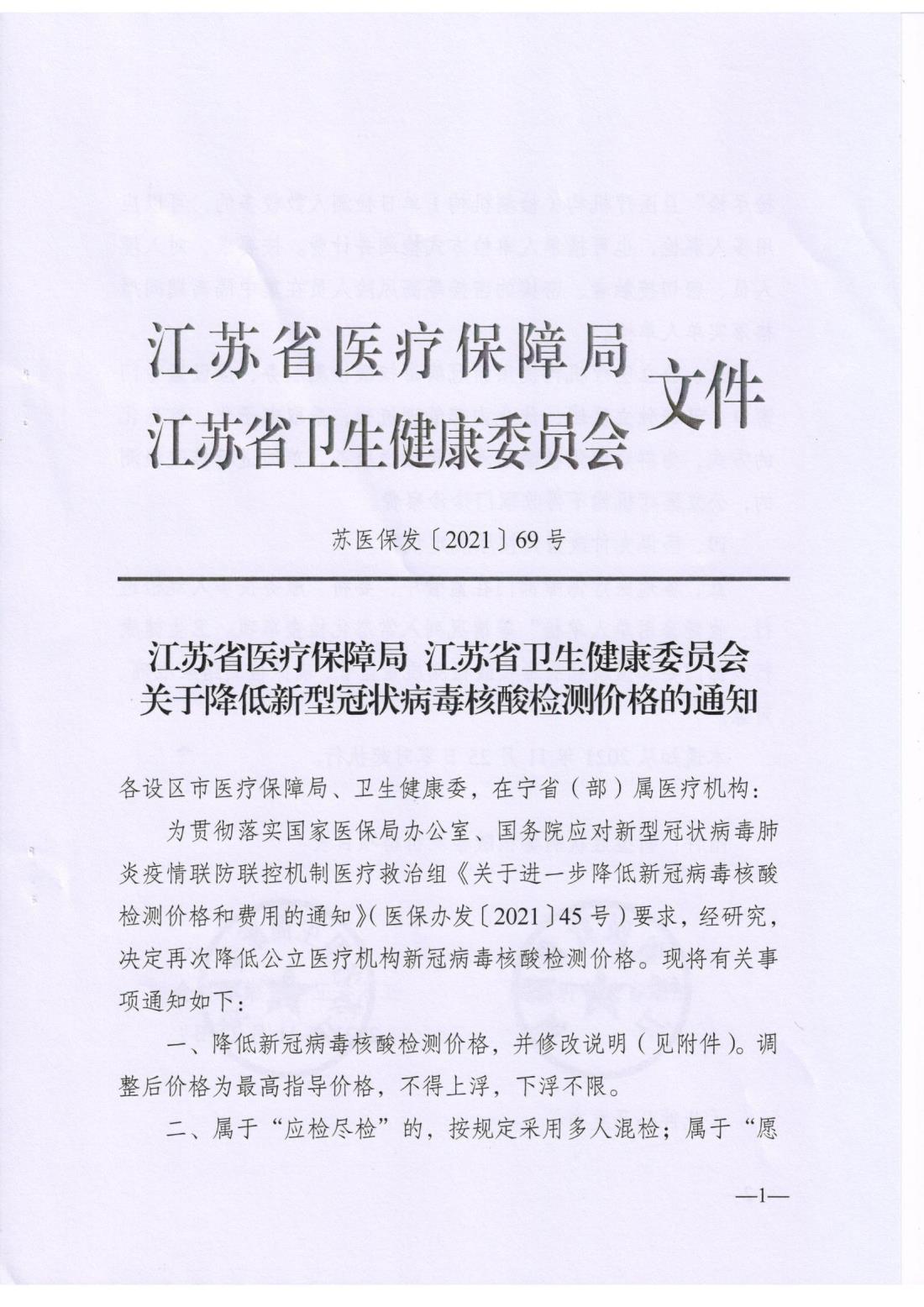 转发《江苏省医疗保障局 江苏省卫生健康委员会 关于降低新型冠状病毒核酸检测价格的通知》的通知