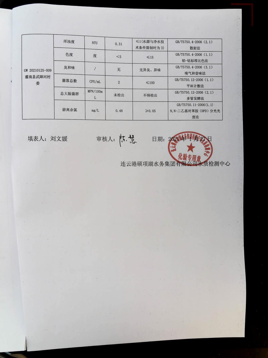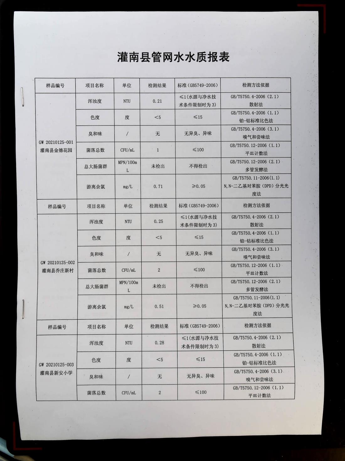 2021年1月下旬管网水水质报表