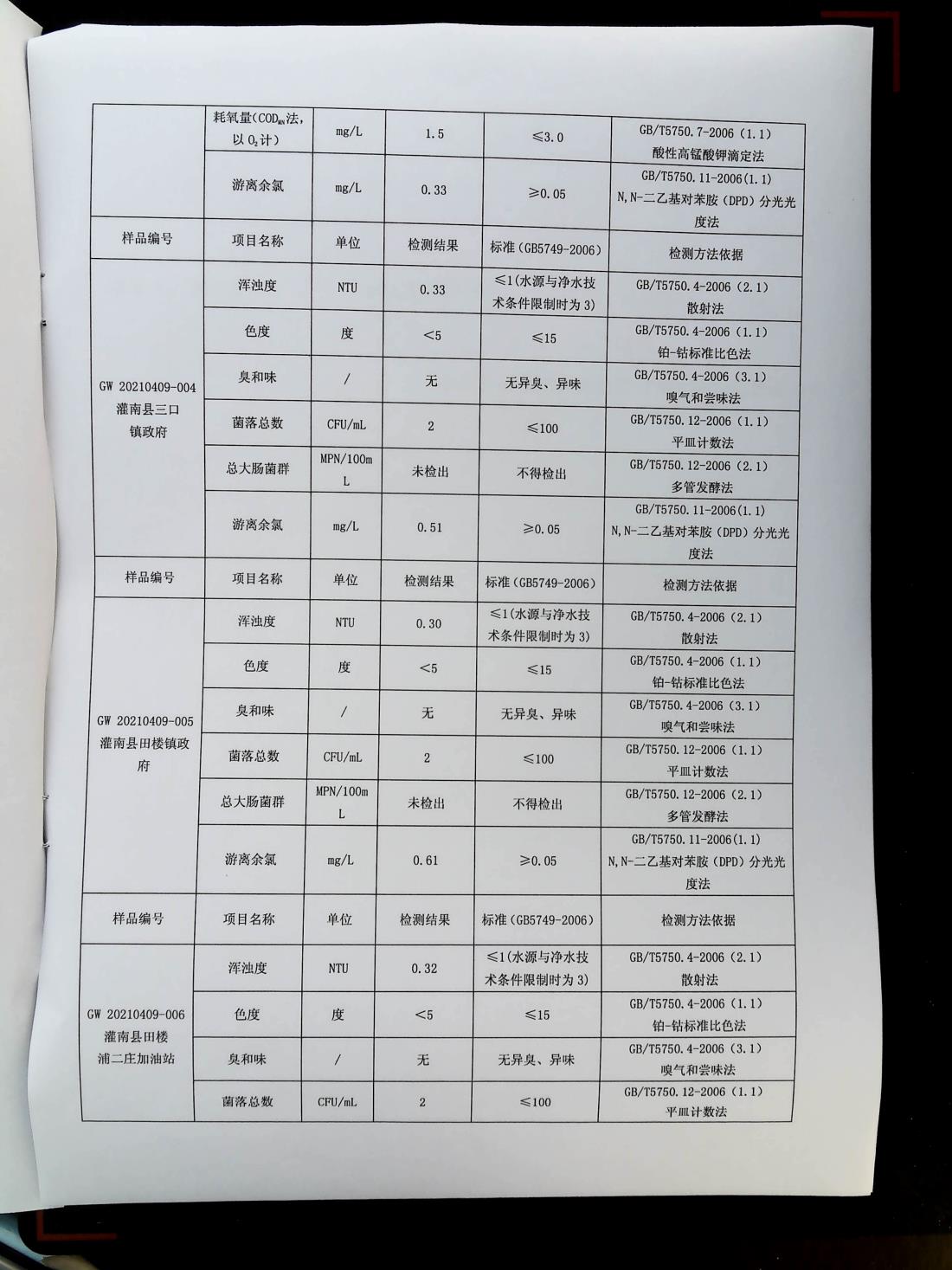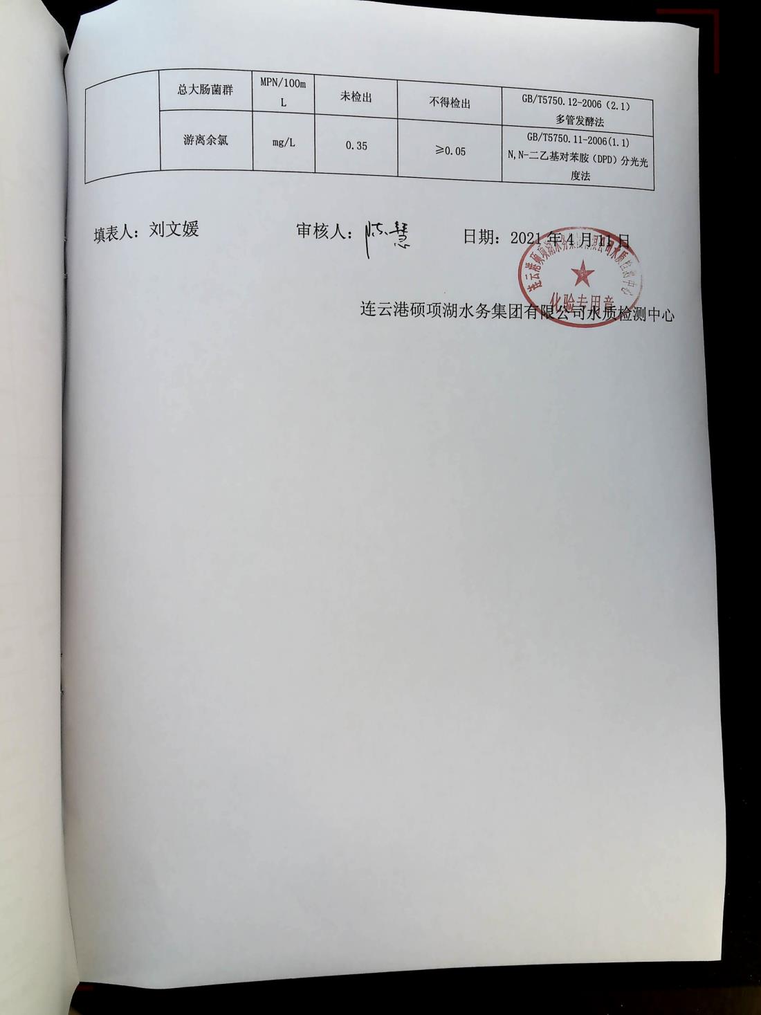 2021年4月上旬管网水水质报表