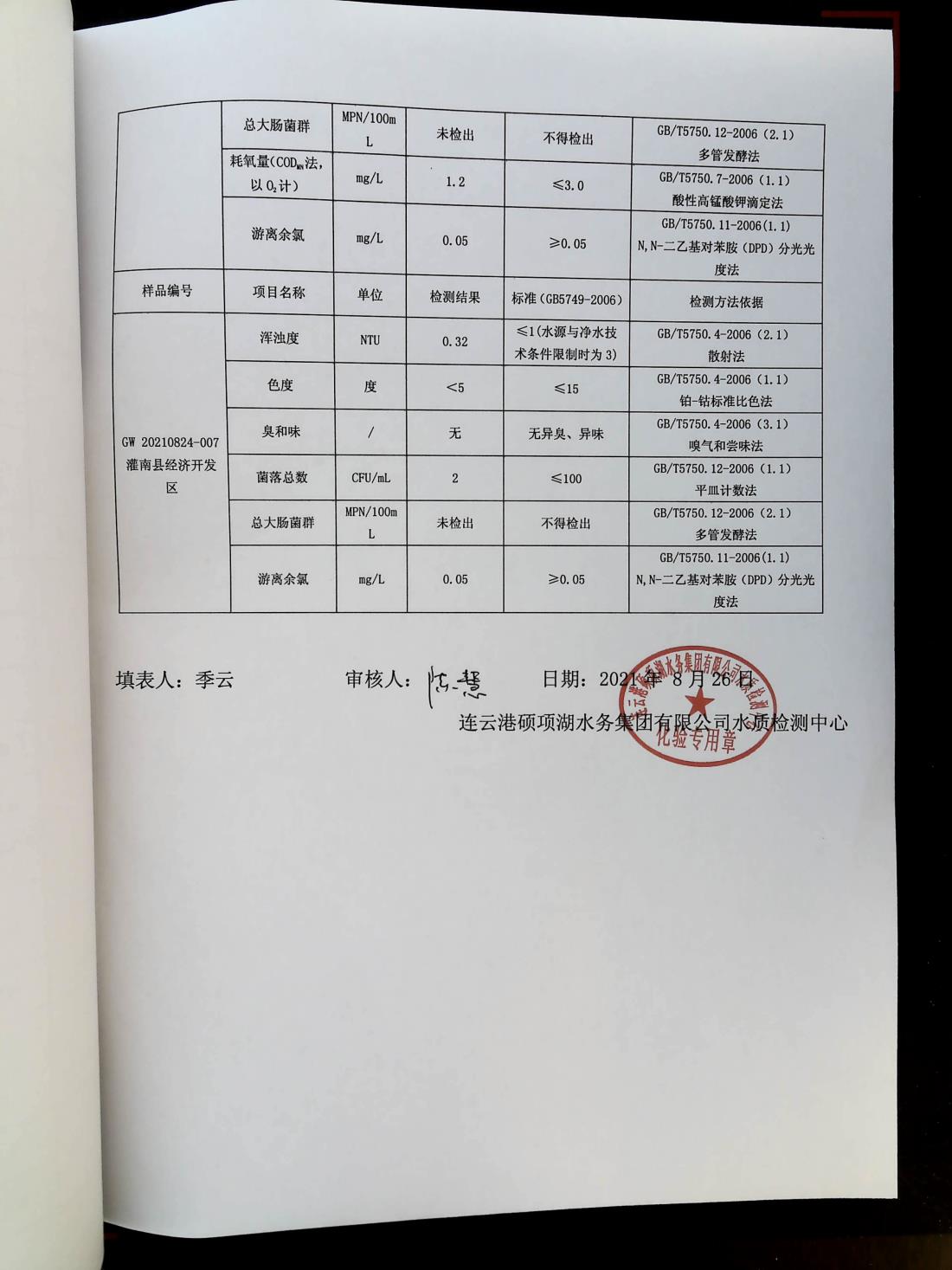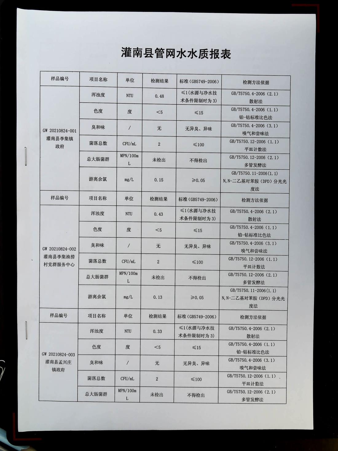 2021年8月下旬管网水水质报表