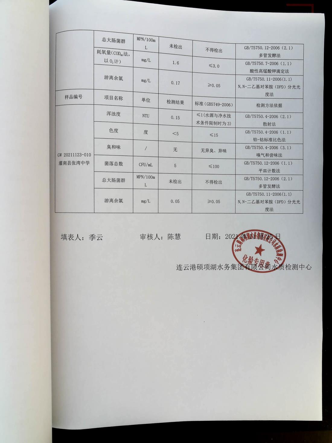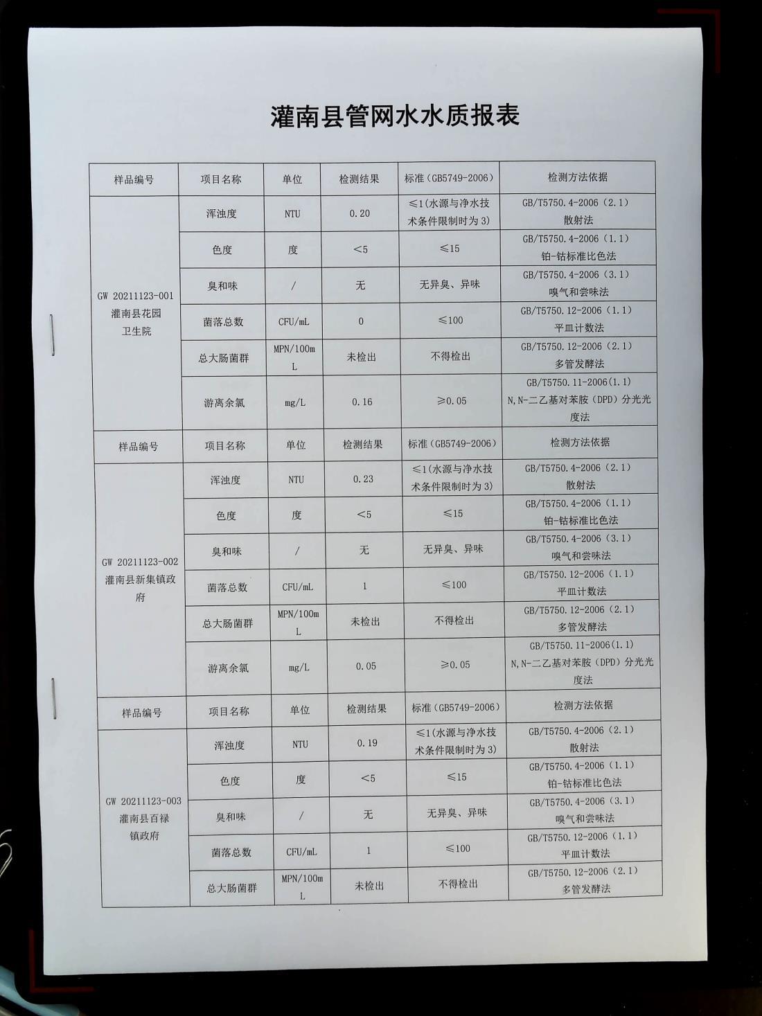 2021年11月下旬管网水水质报表