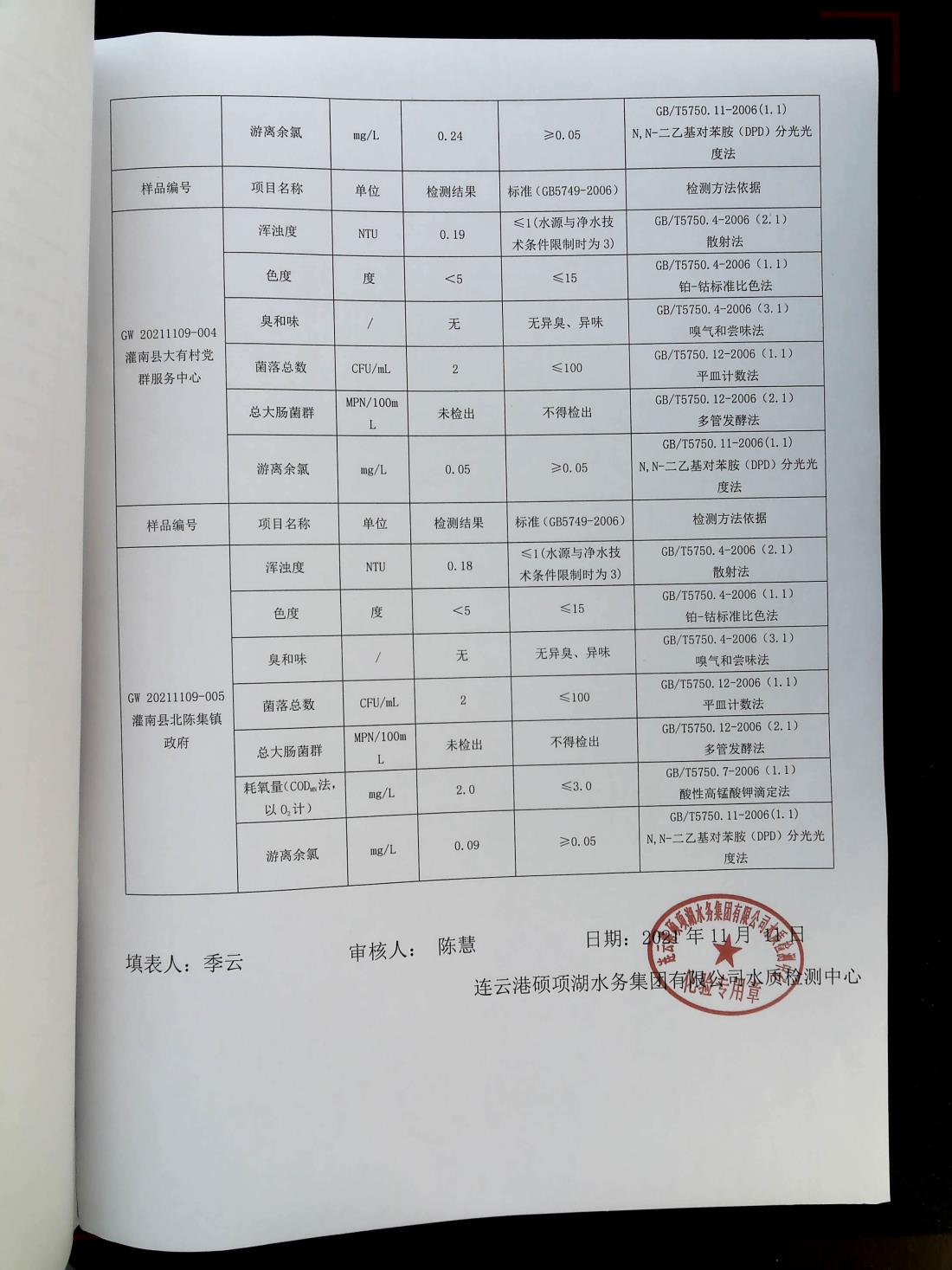 2021年11月上旬管网水水质报表