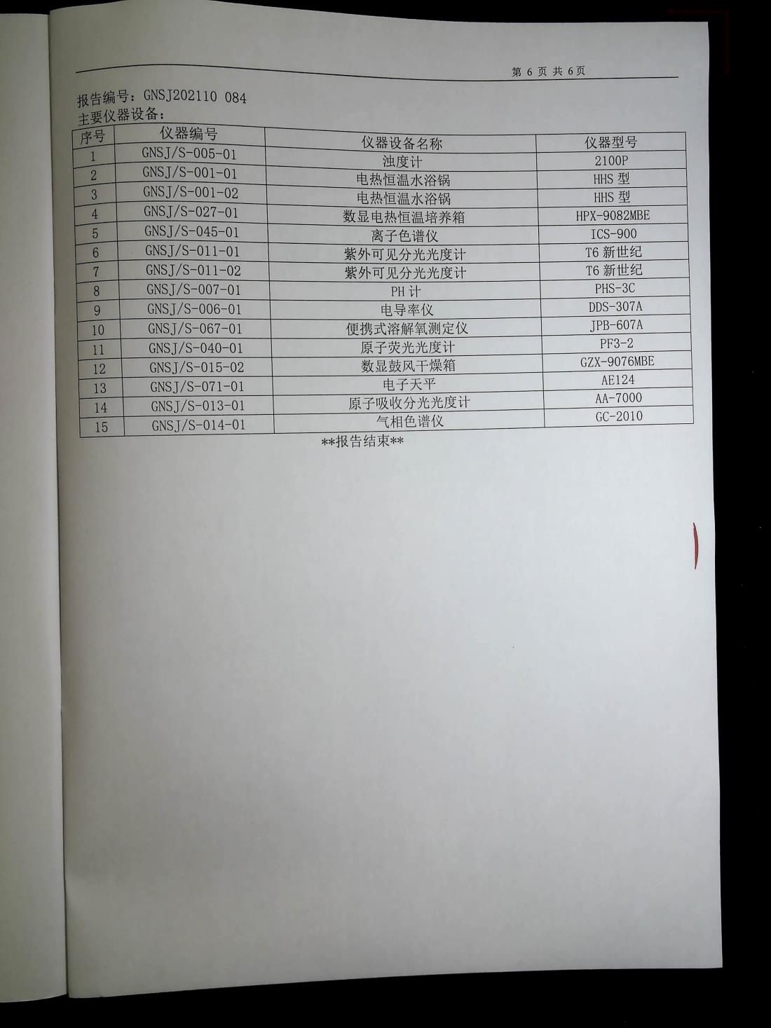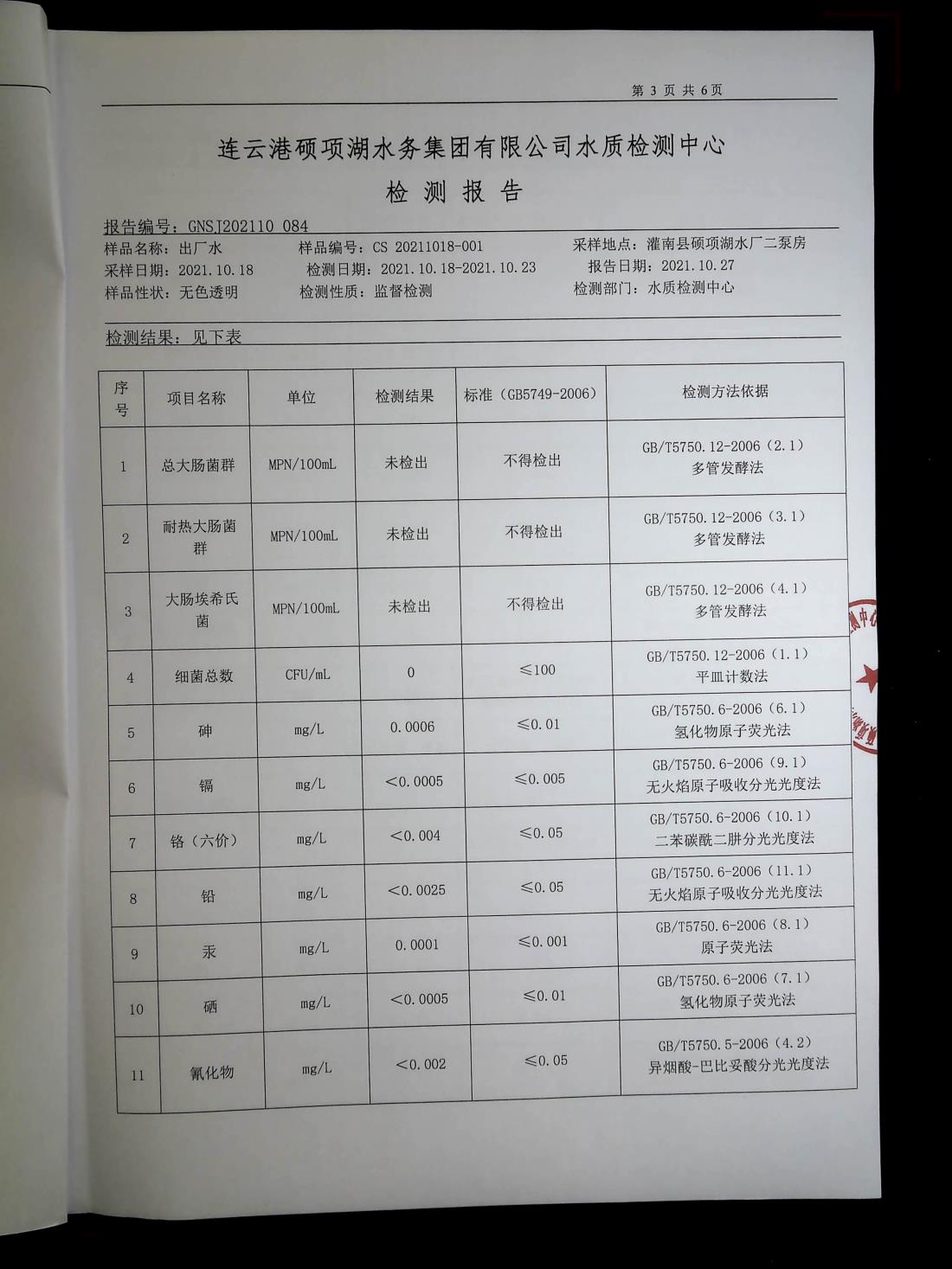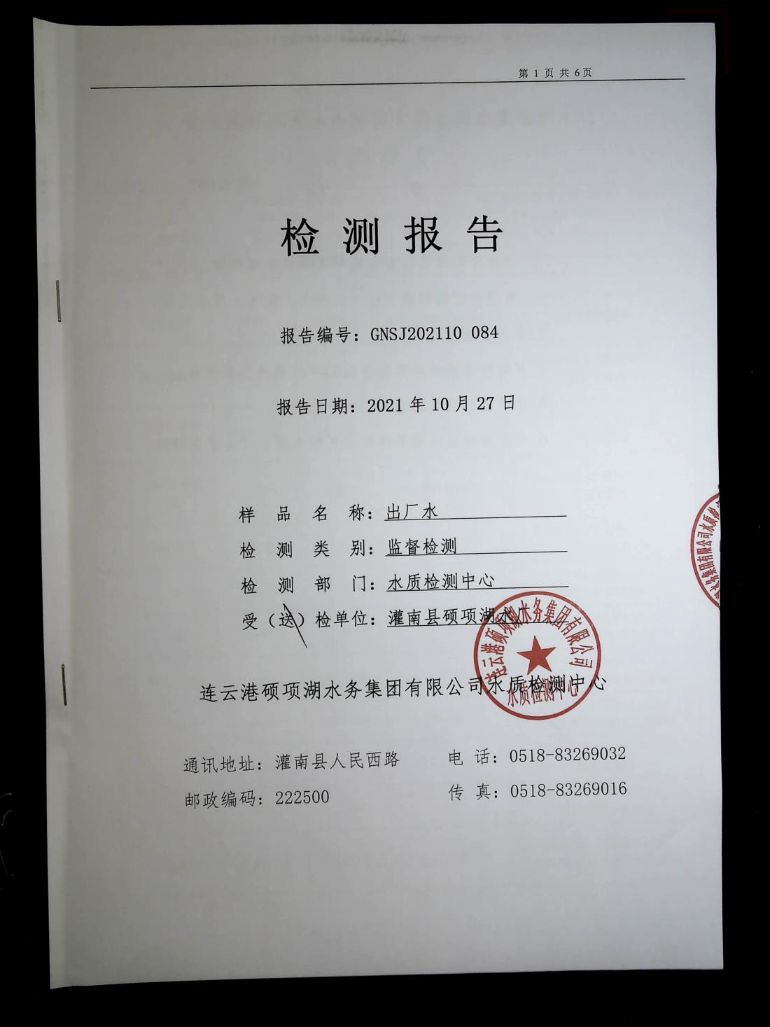 2021年10月硕项湖水厂出厂水监督检测报告