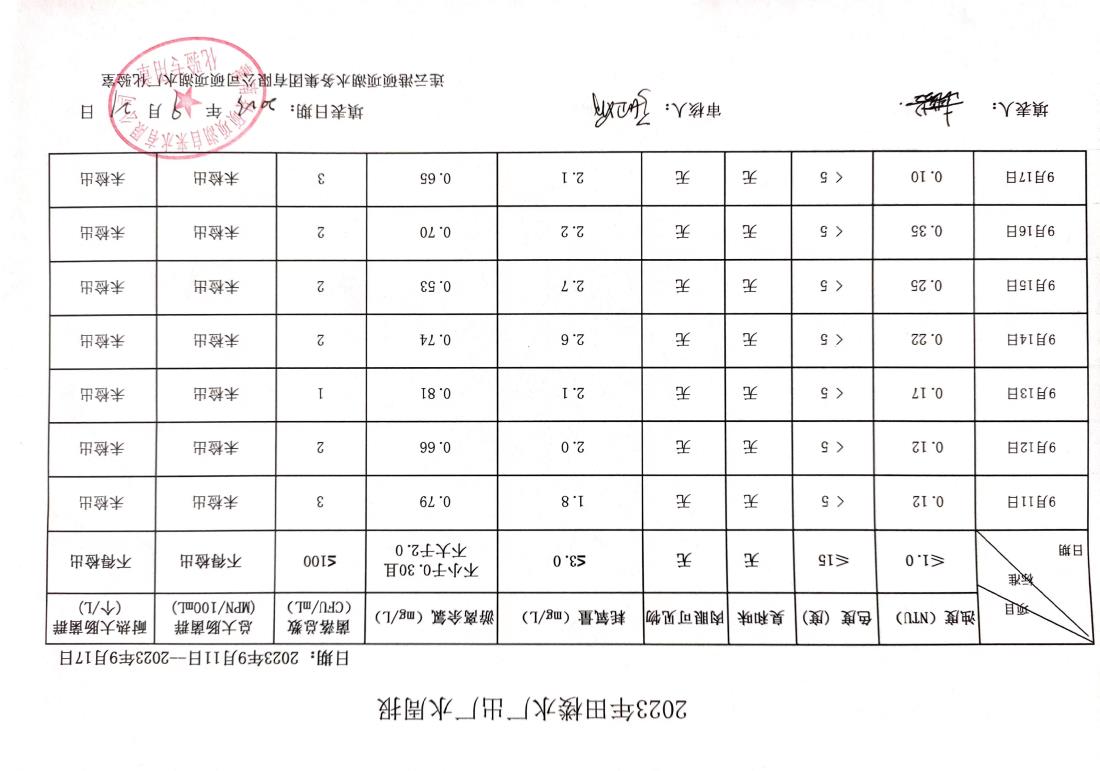 2023年田楼水厂出厂水水质周报(9.11-9.17)