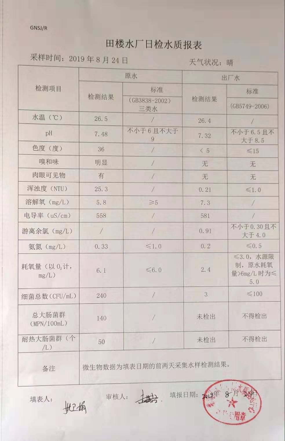 2019年8月24日田楼水厂水质报表